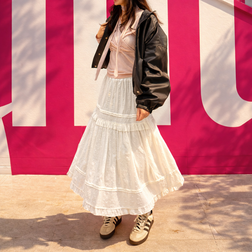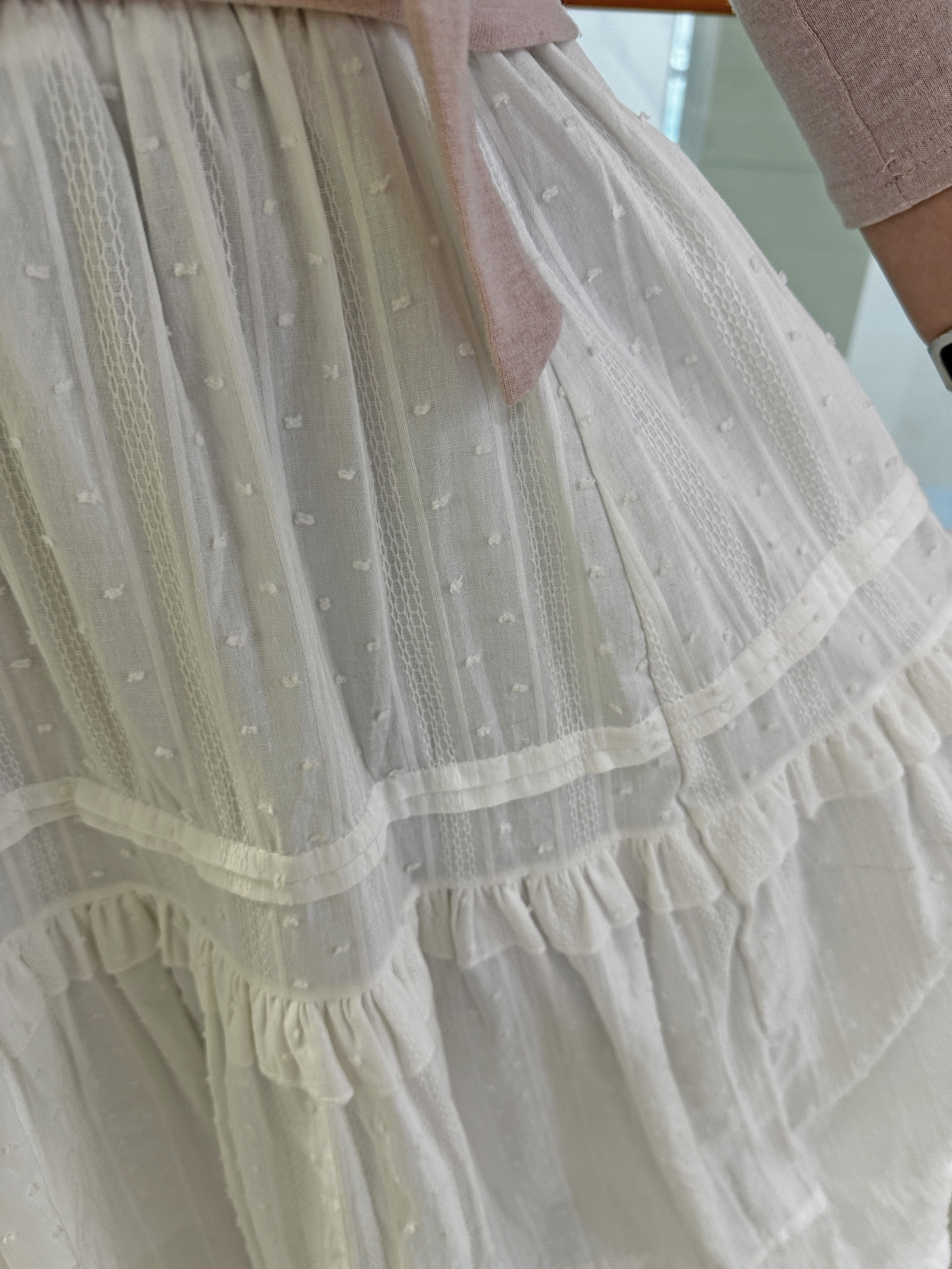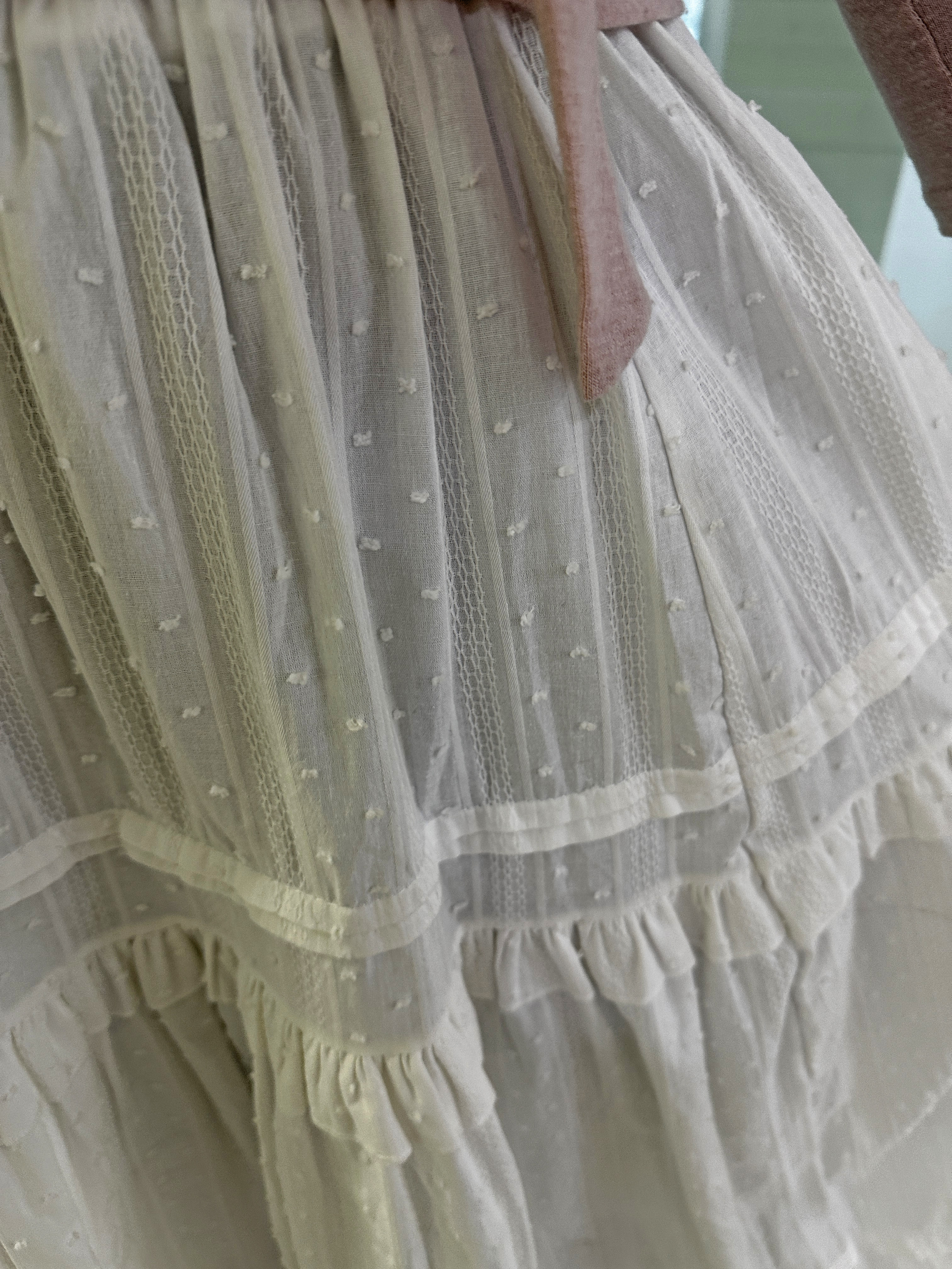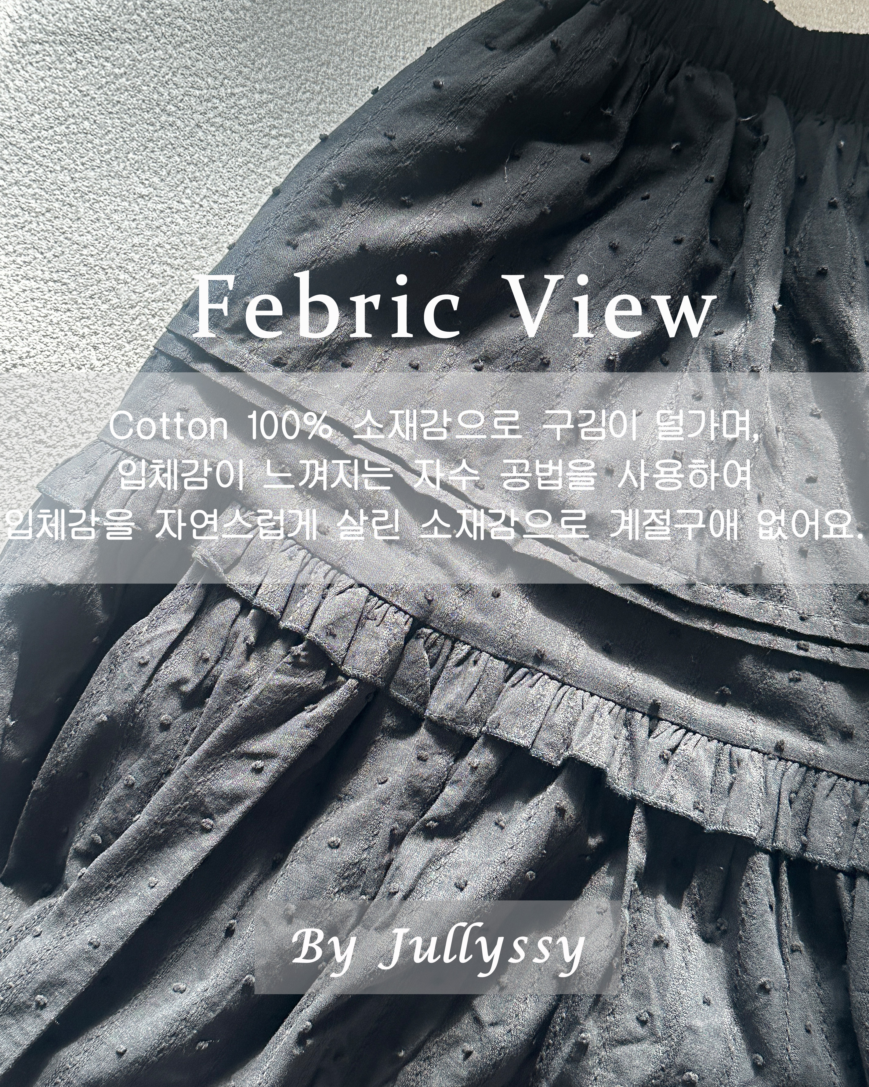 티지한 도트 텍스처와 풍성한 티어드 실루엣으로