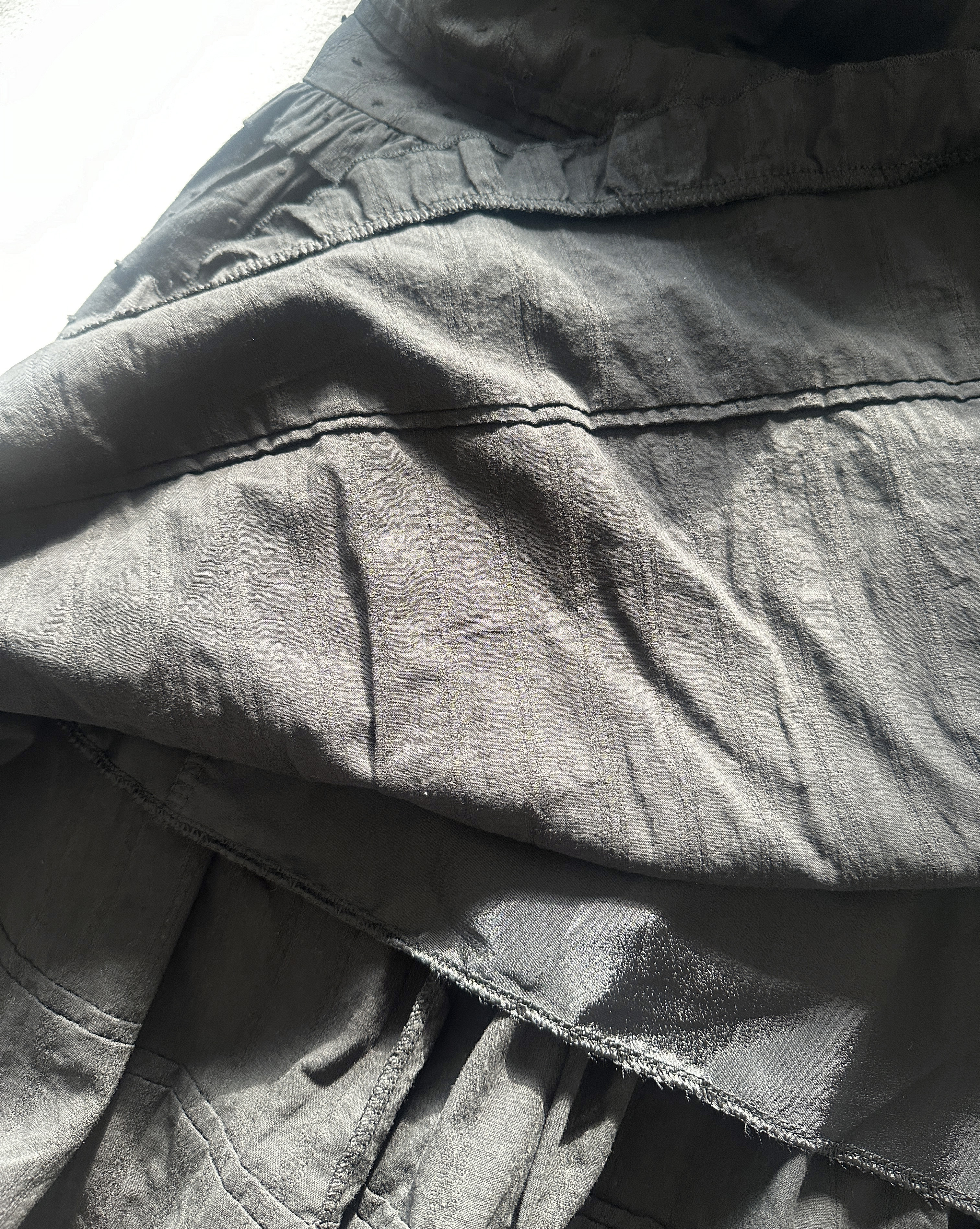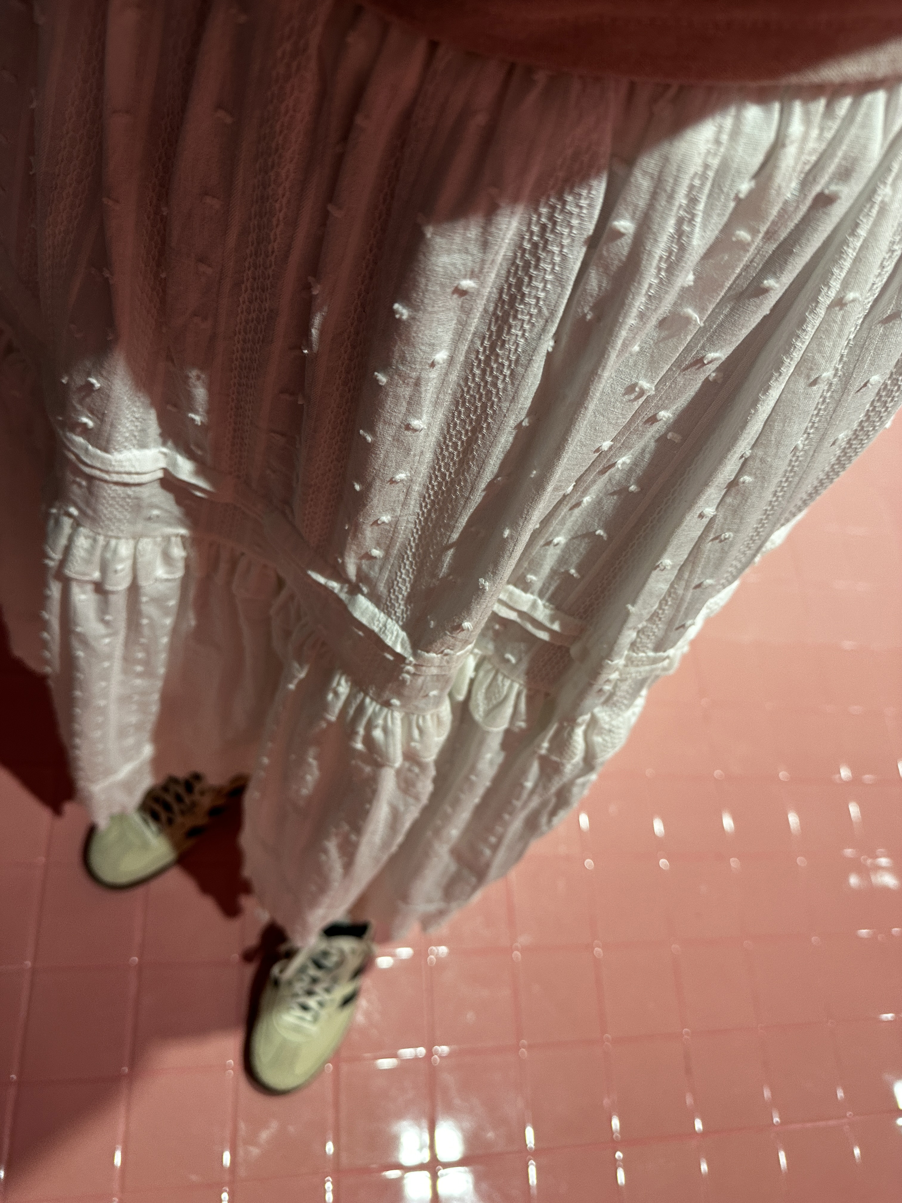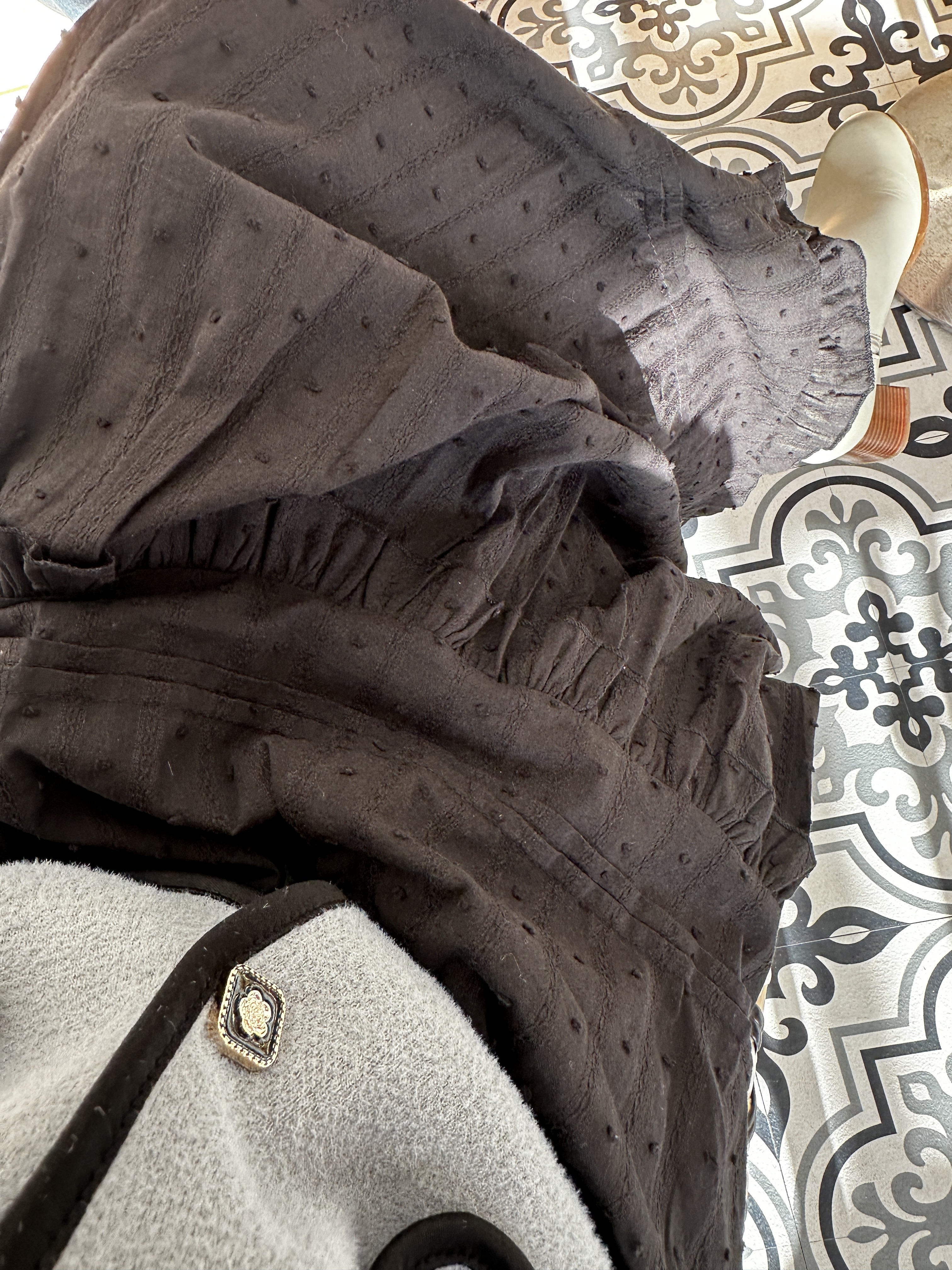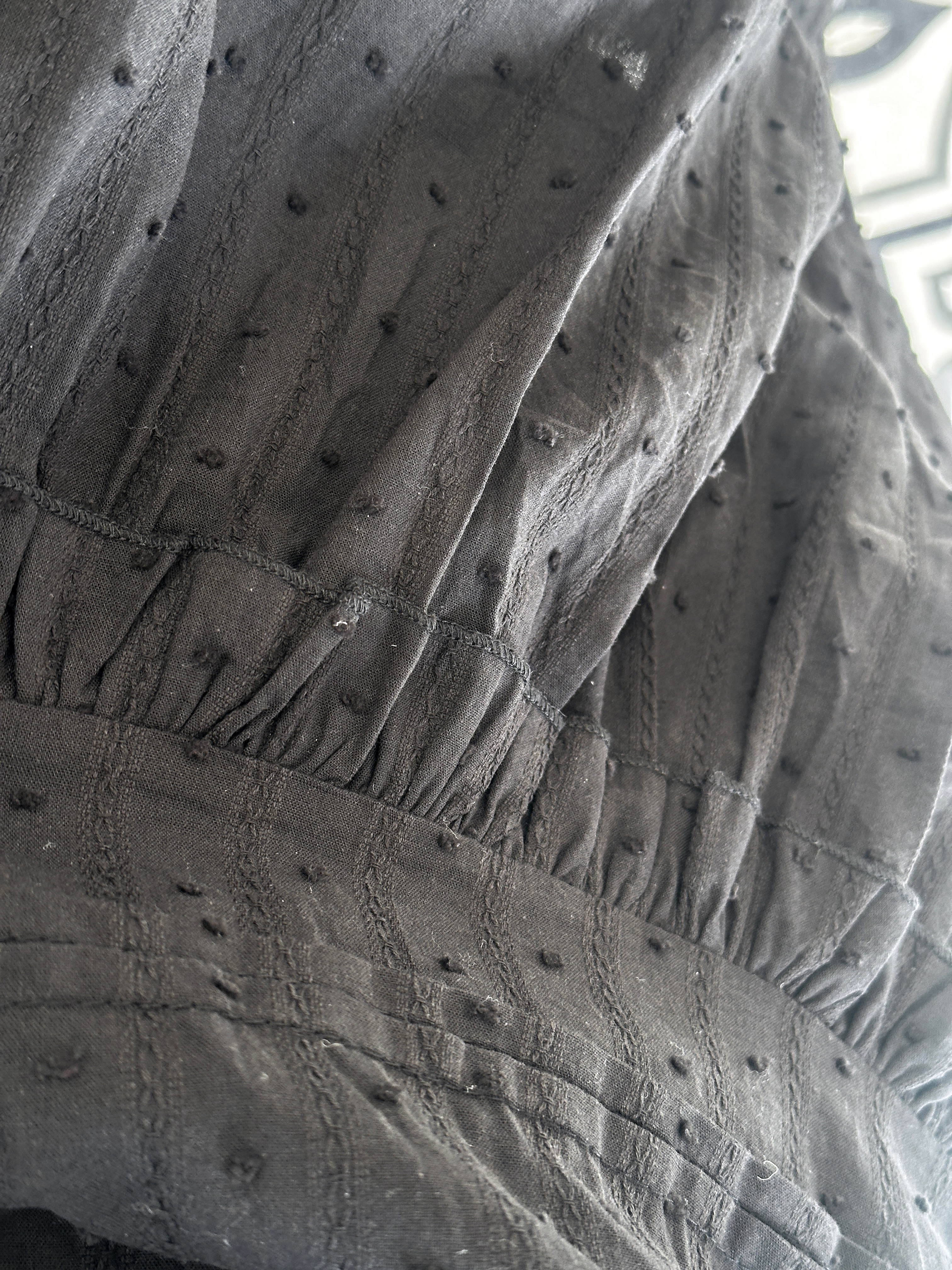 티지한 도트 텍스처와 풍성한 티어드 실루엣으로