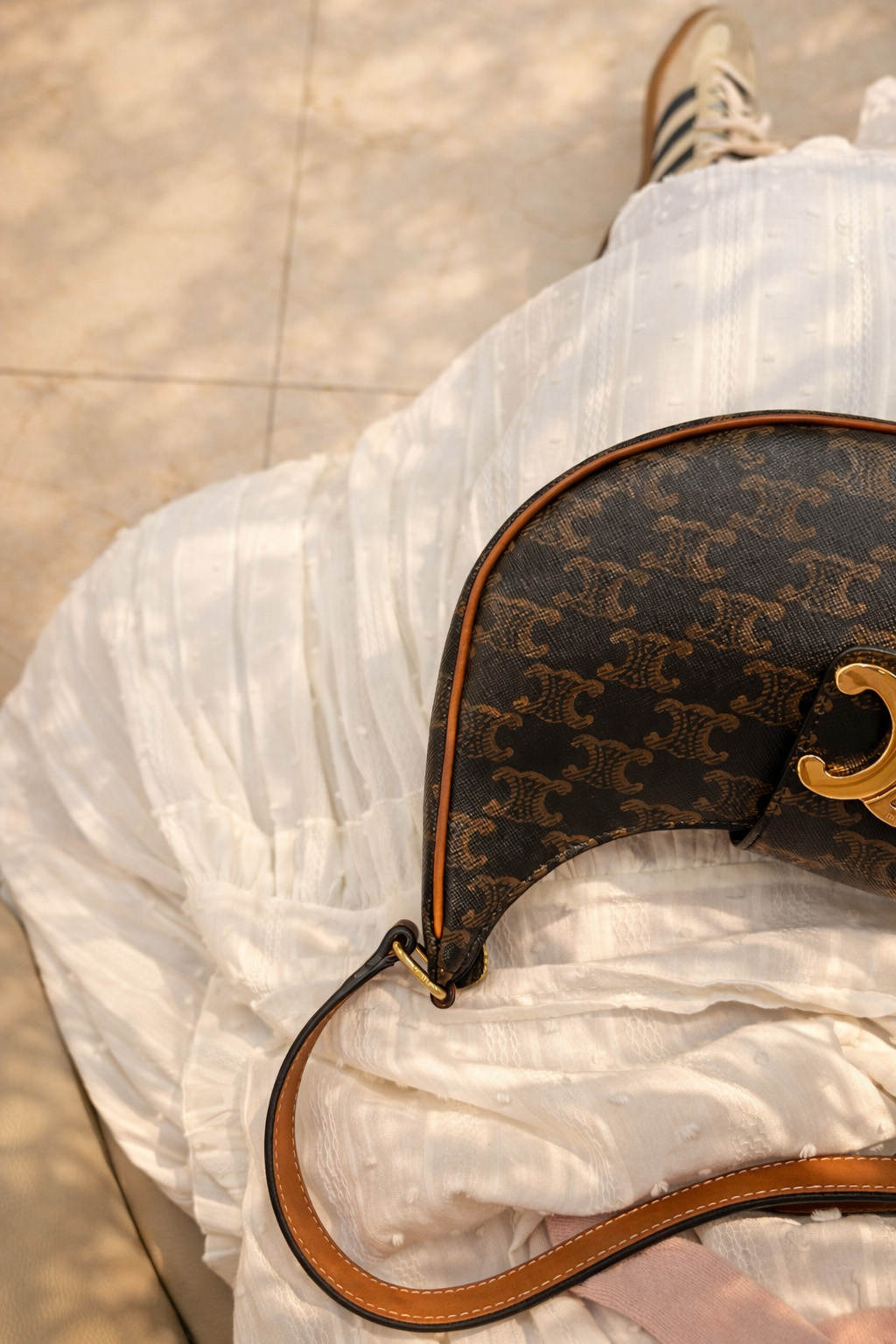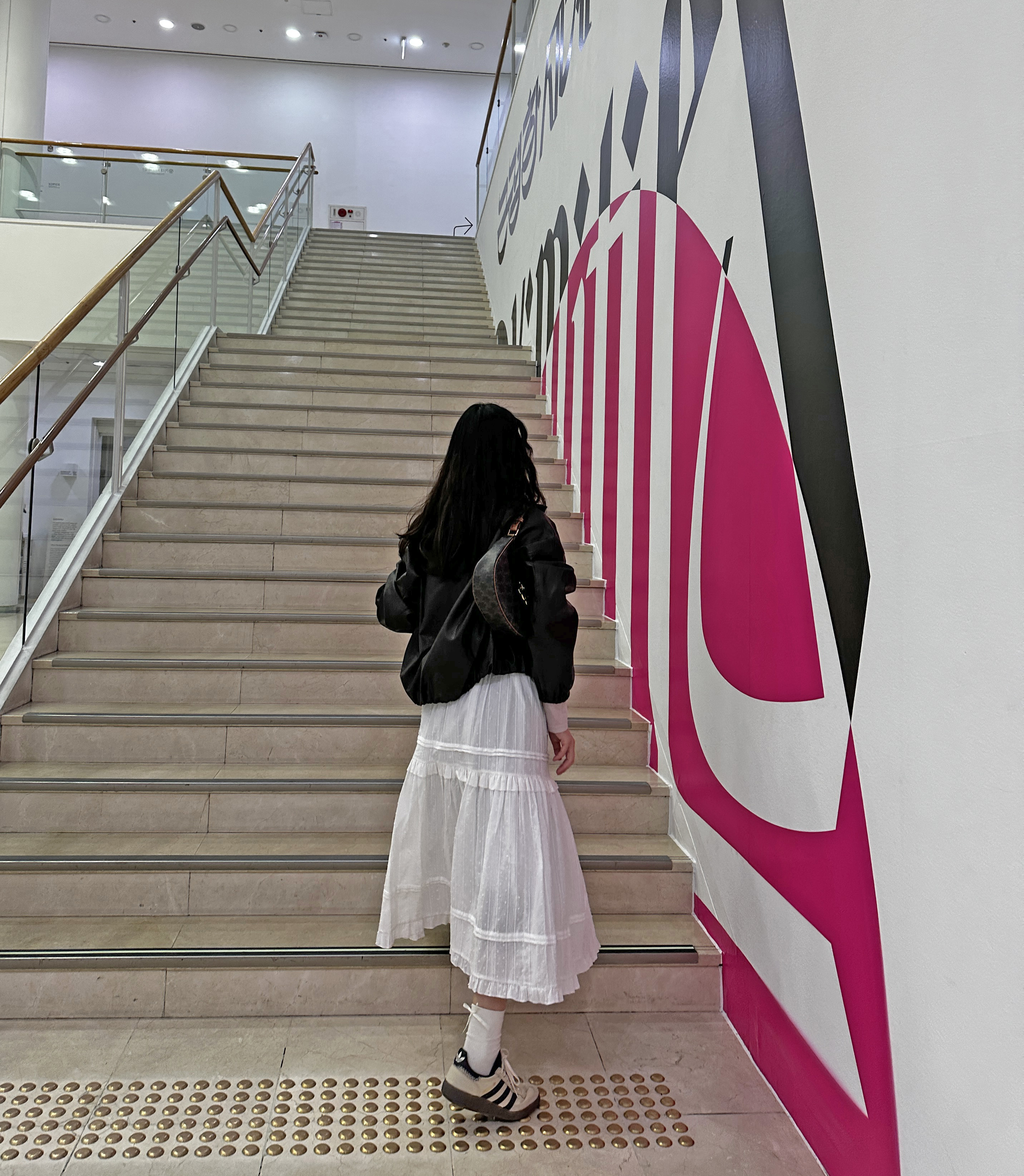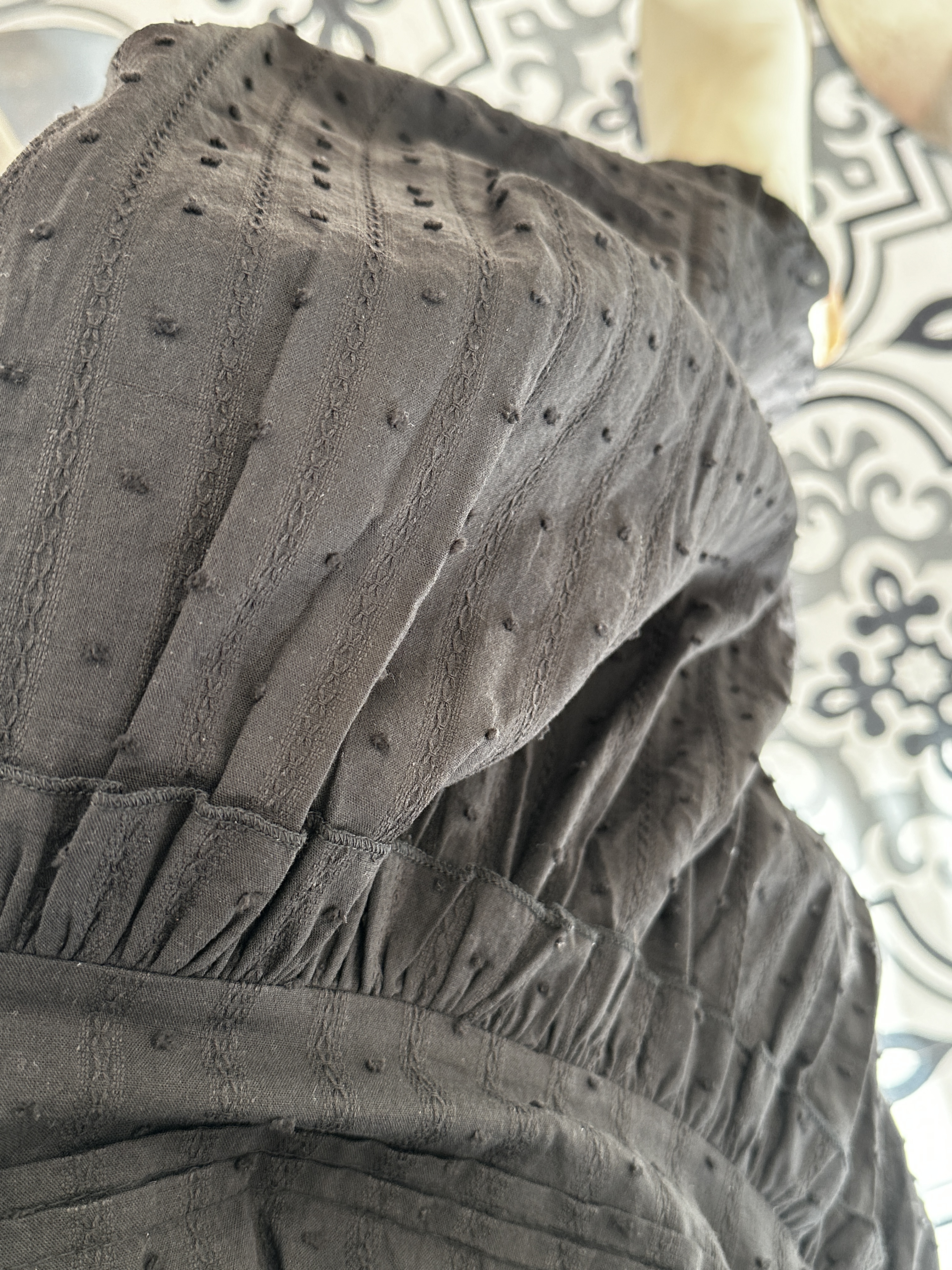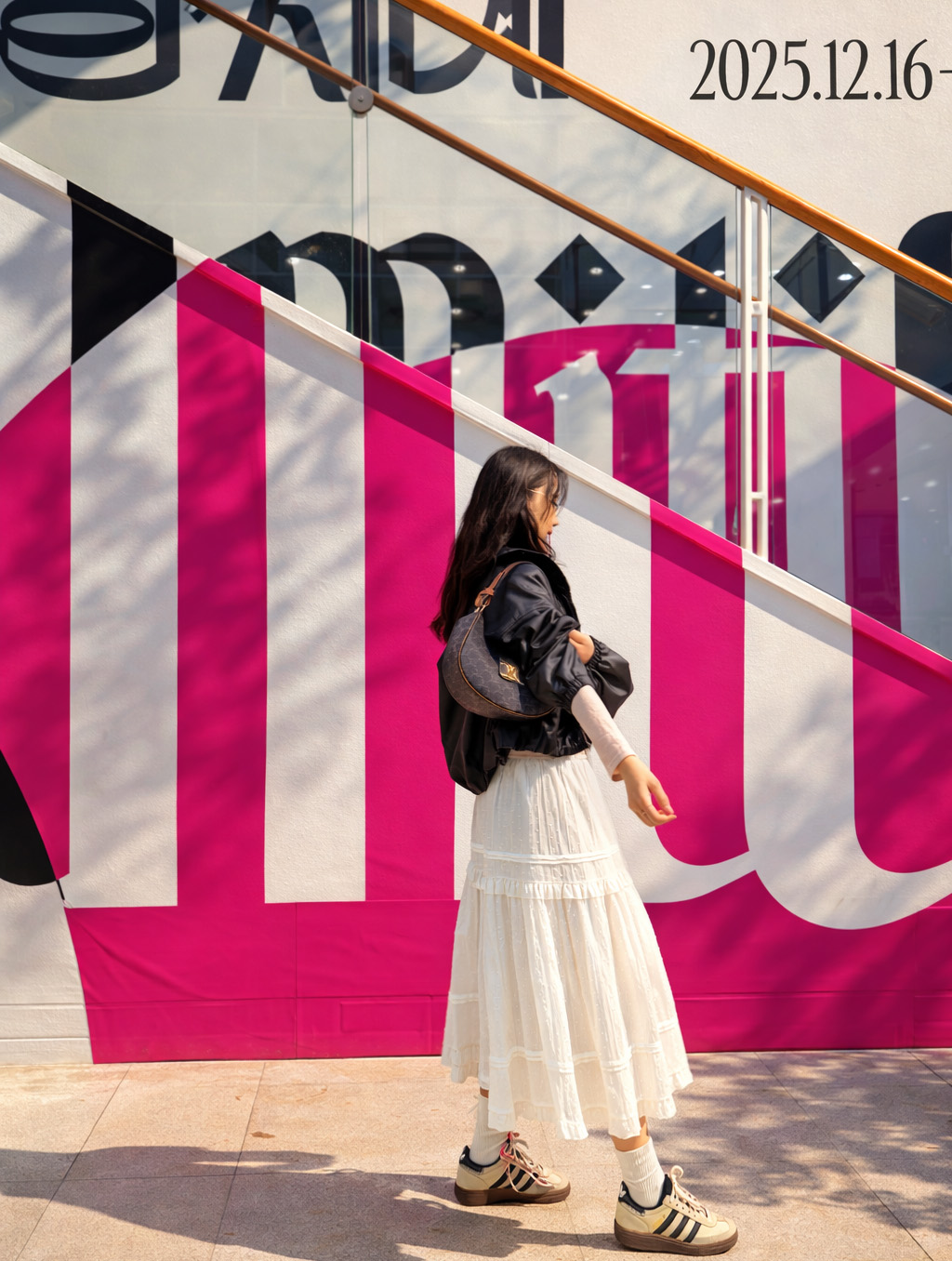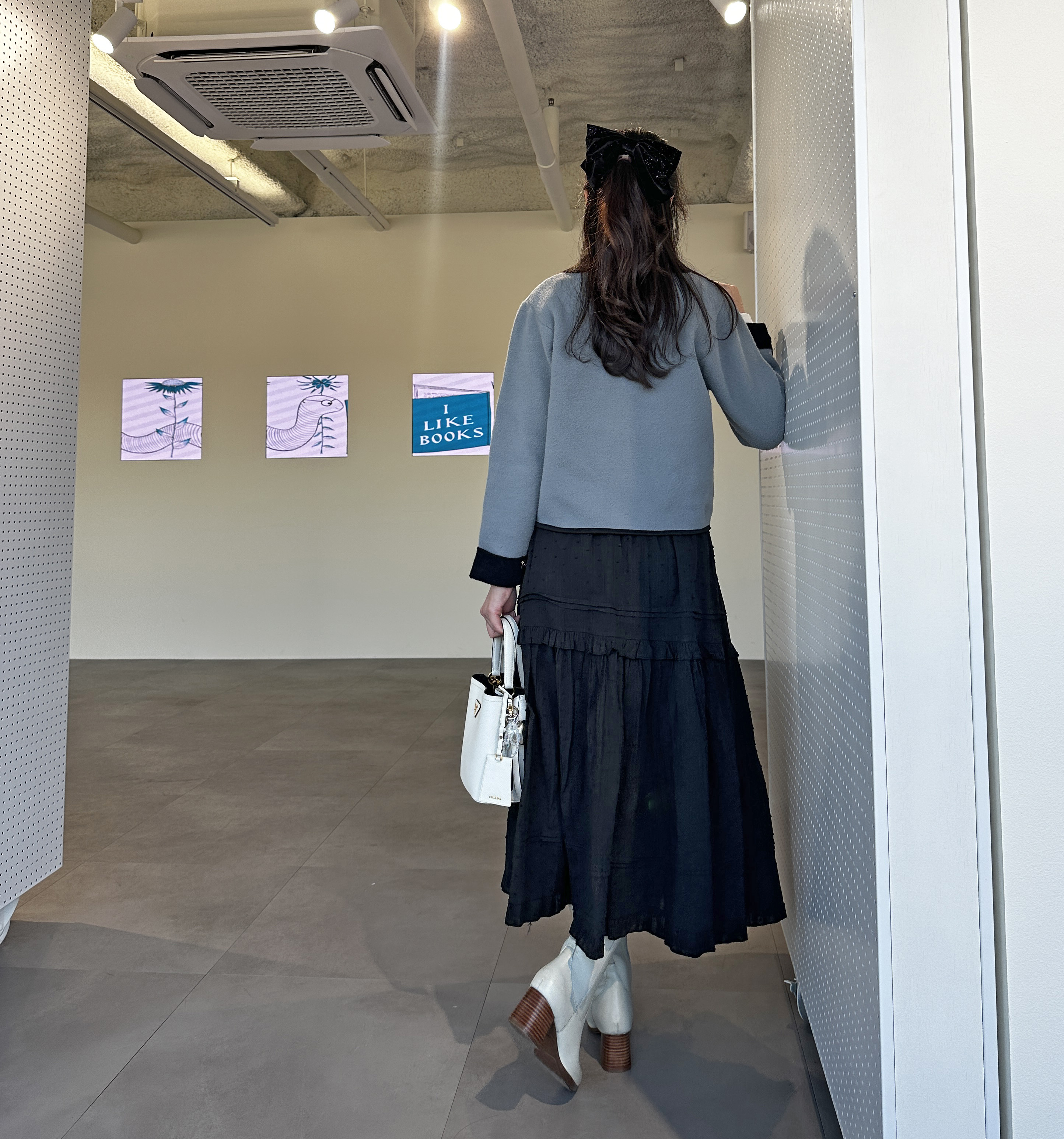 티지한 도트 텍스처와 풍성한 티어드 실루엣으로