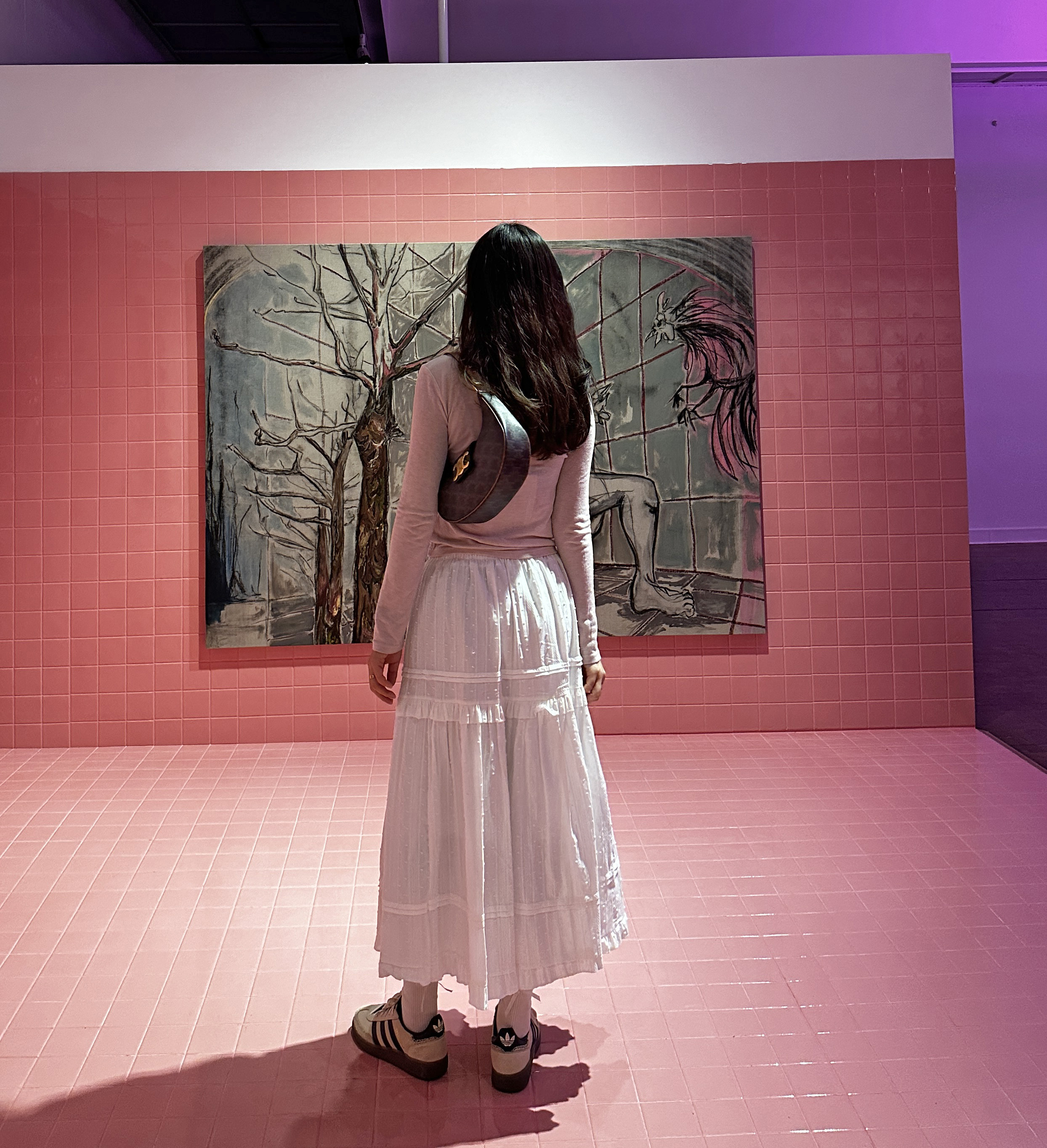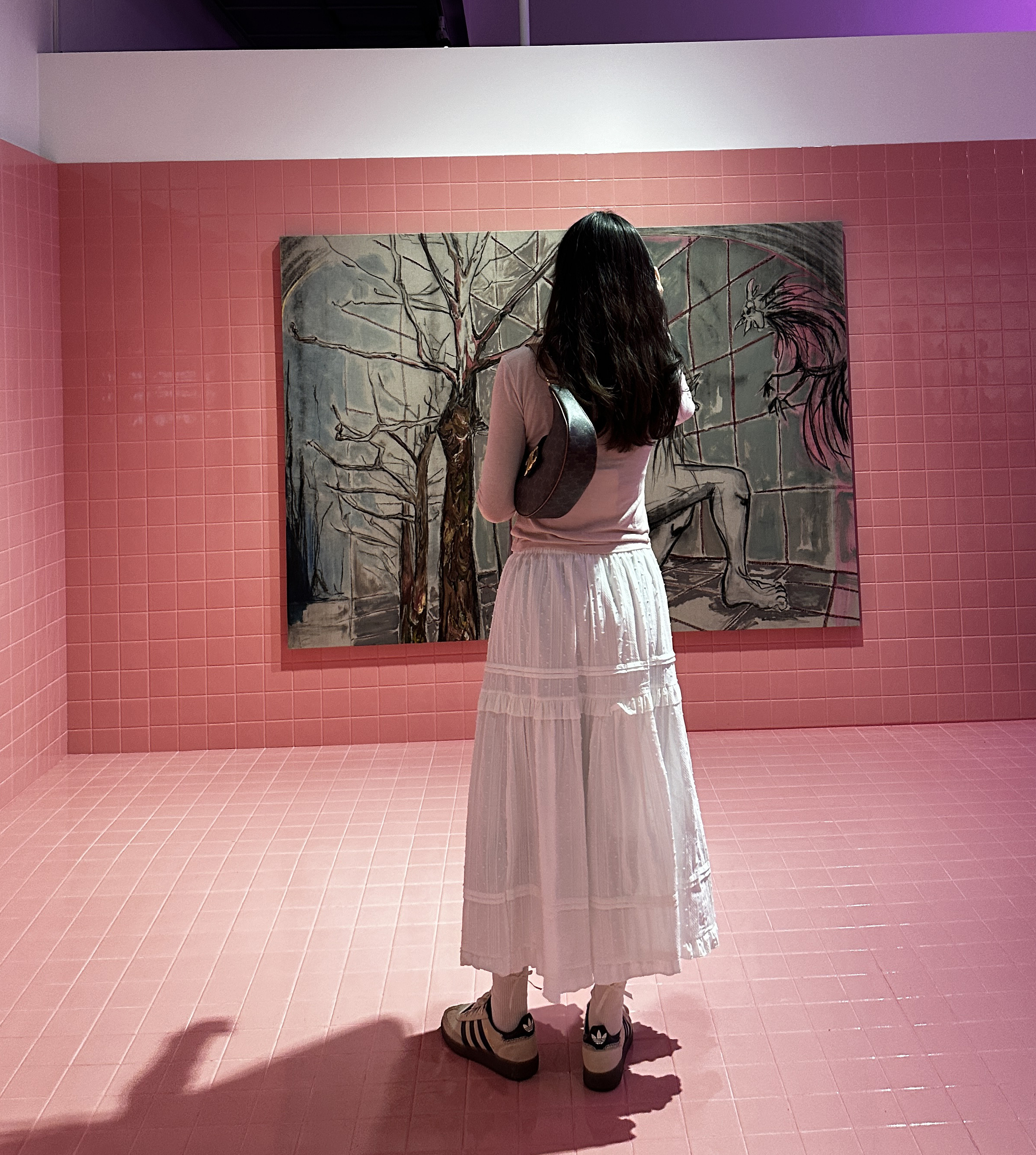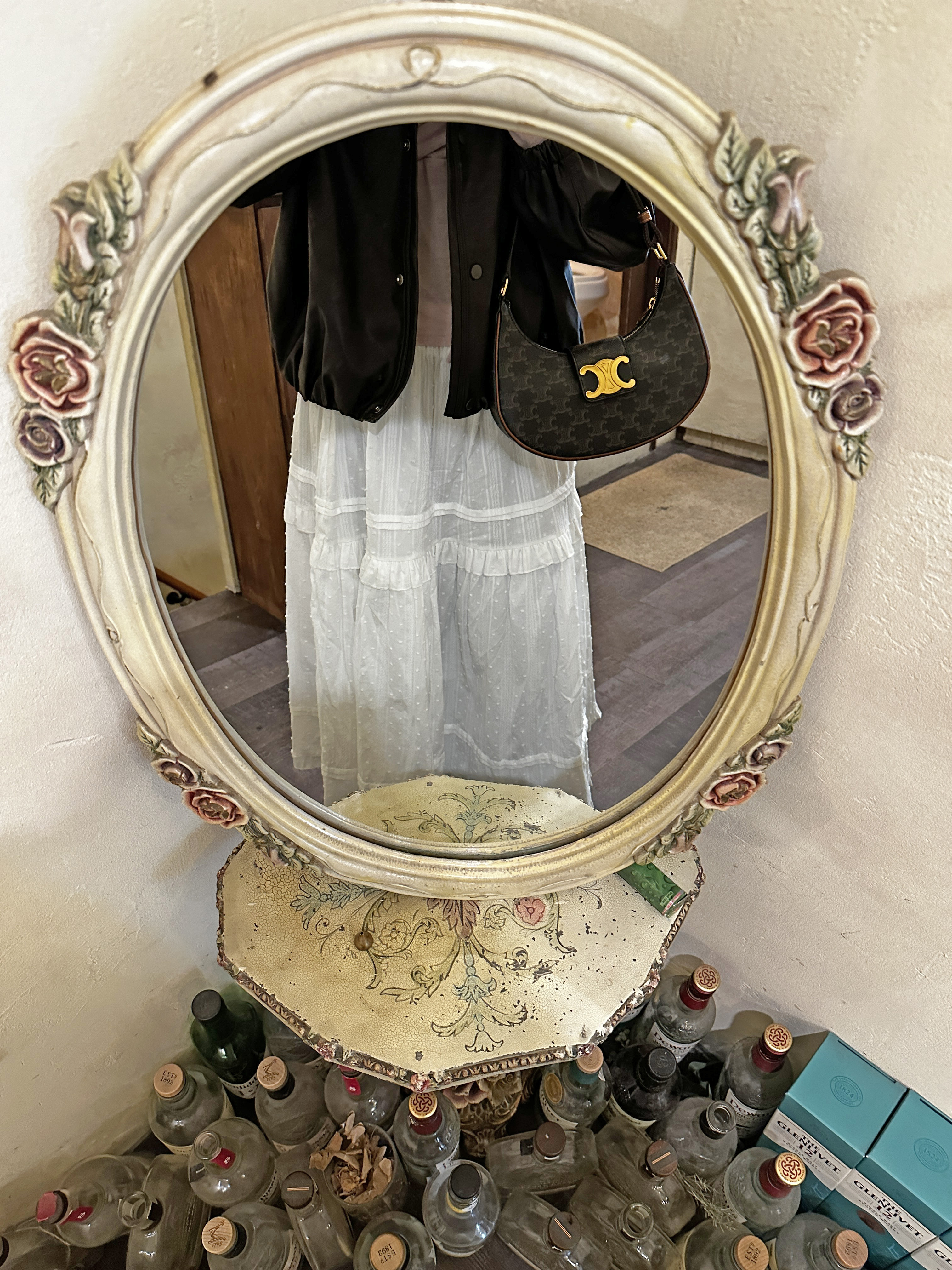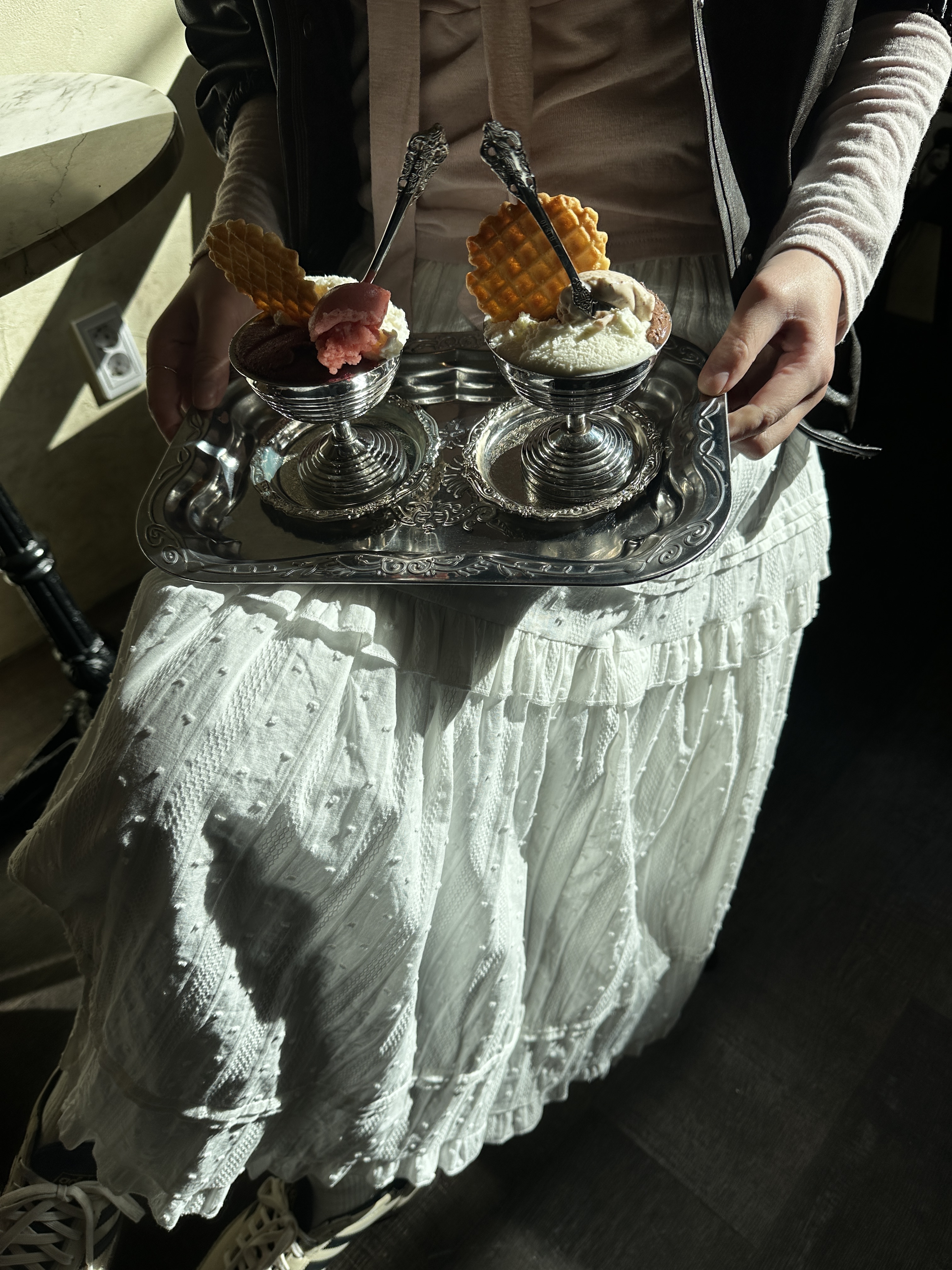 티지한 도트 텍스처와 풍성한 티어드 실루엣으로