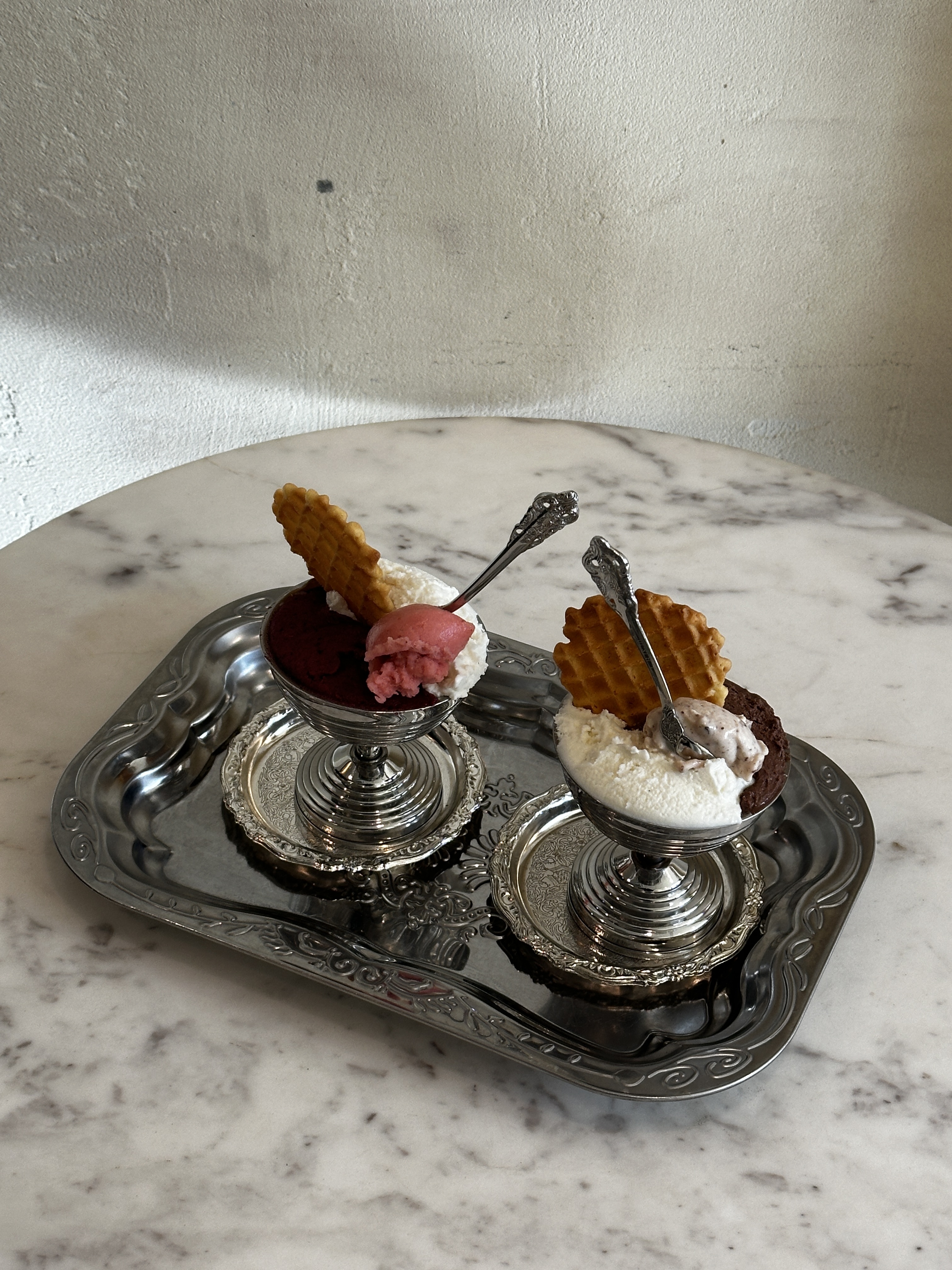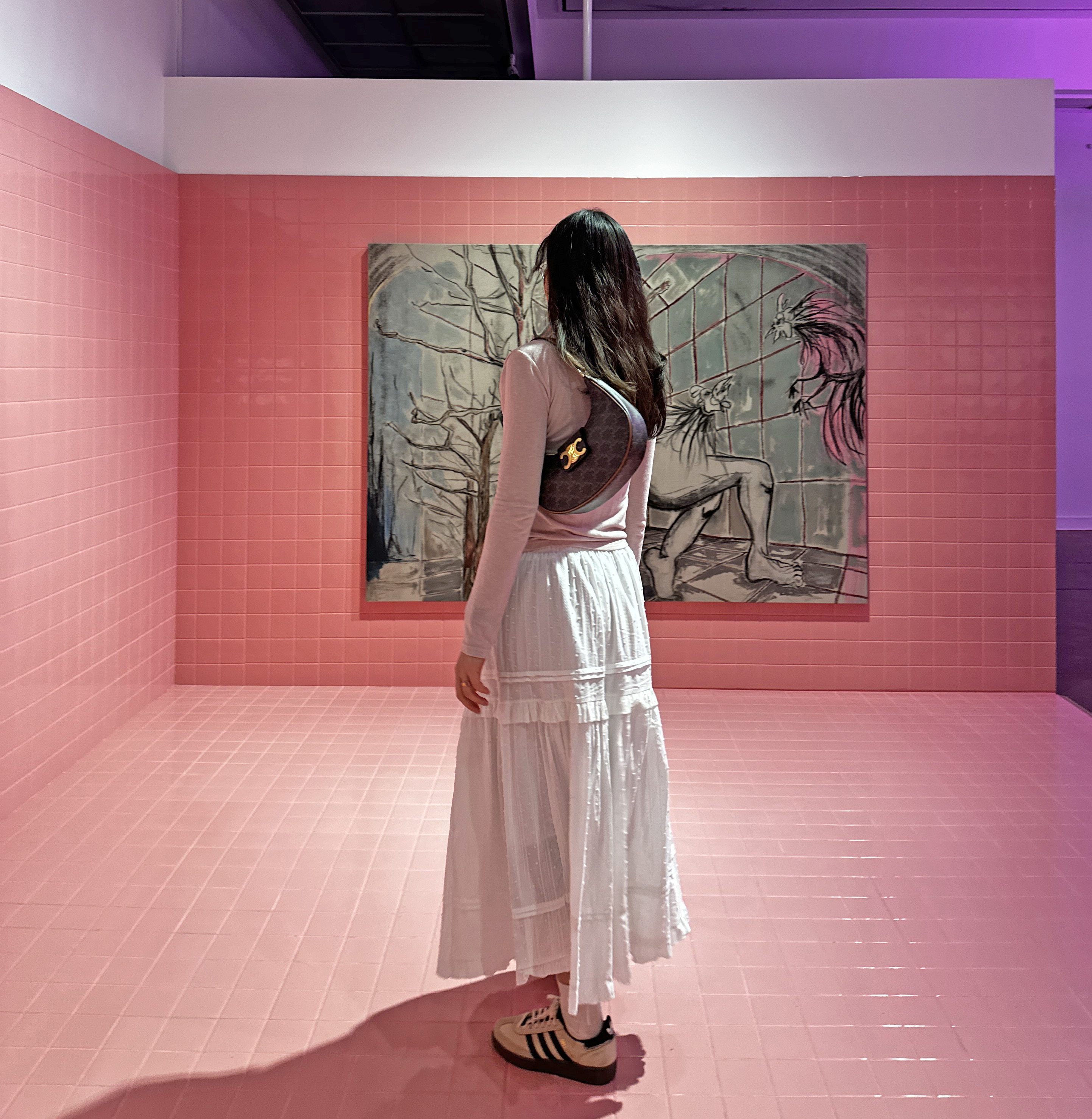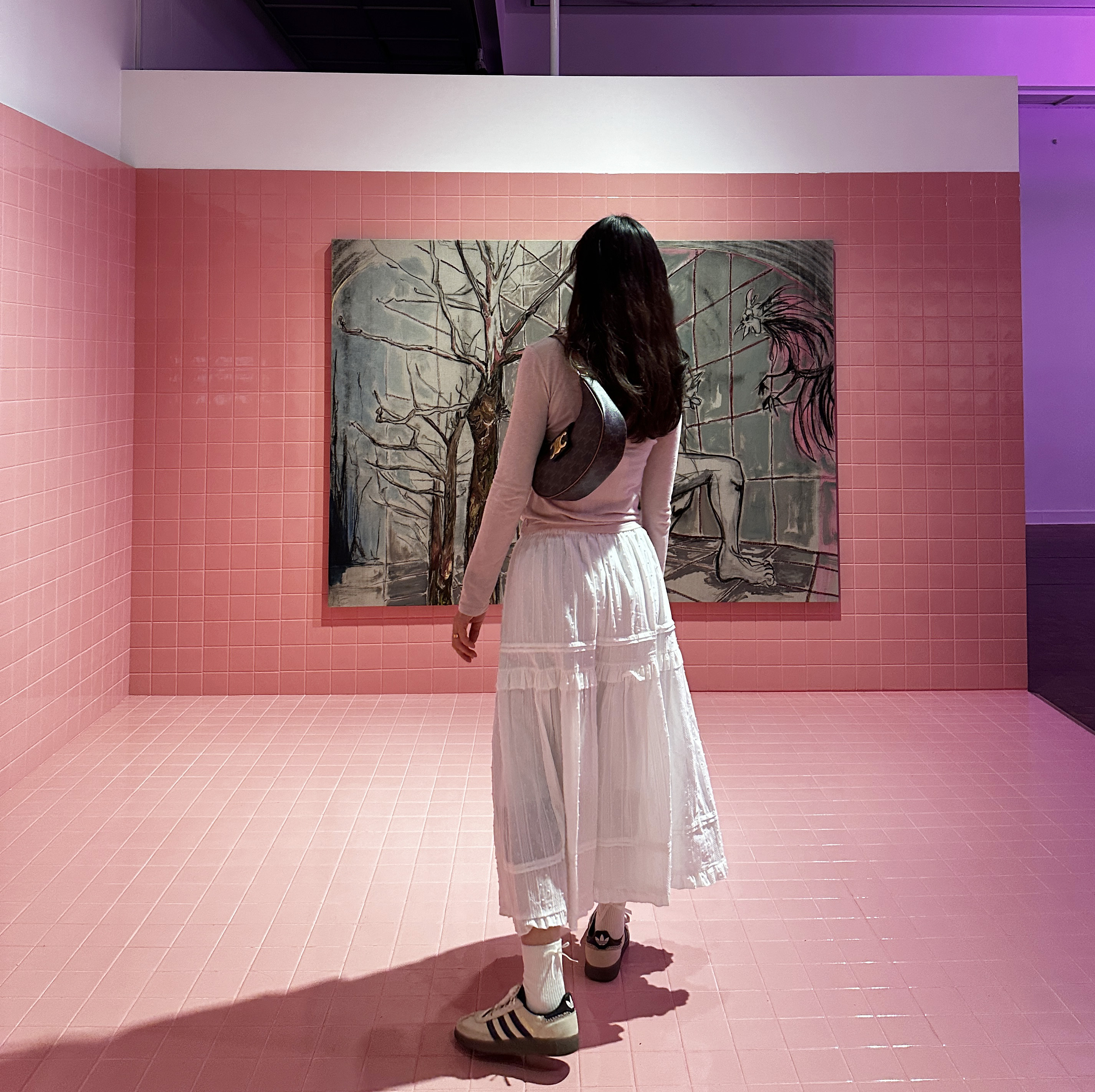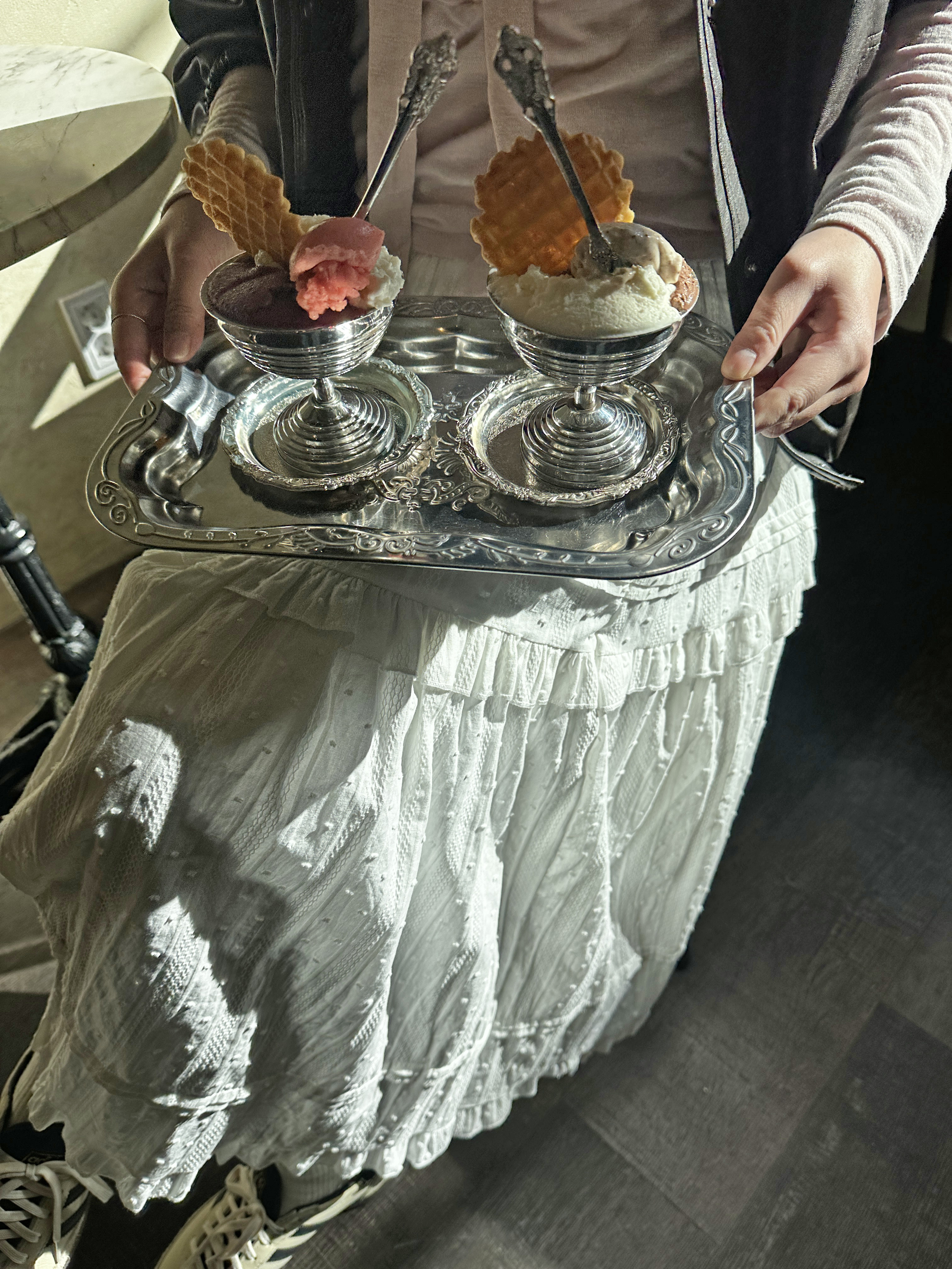 티지한 도트 텍스처와 풍성한 티어드 실루엣으로
