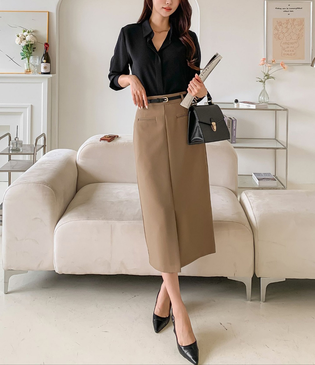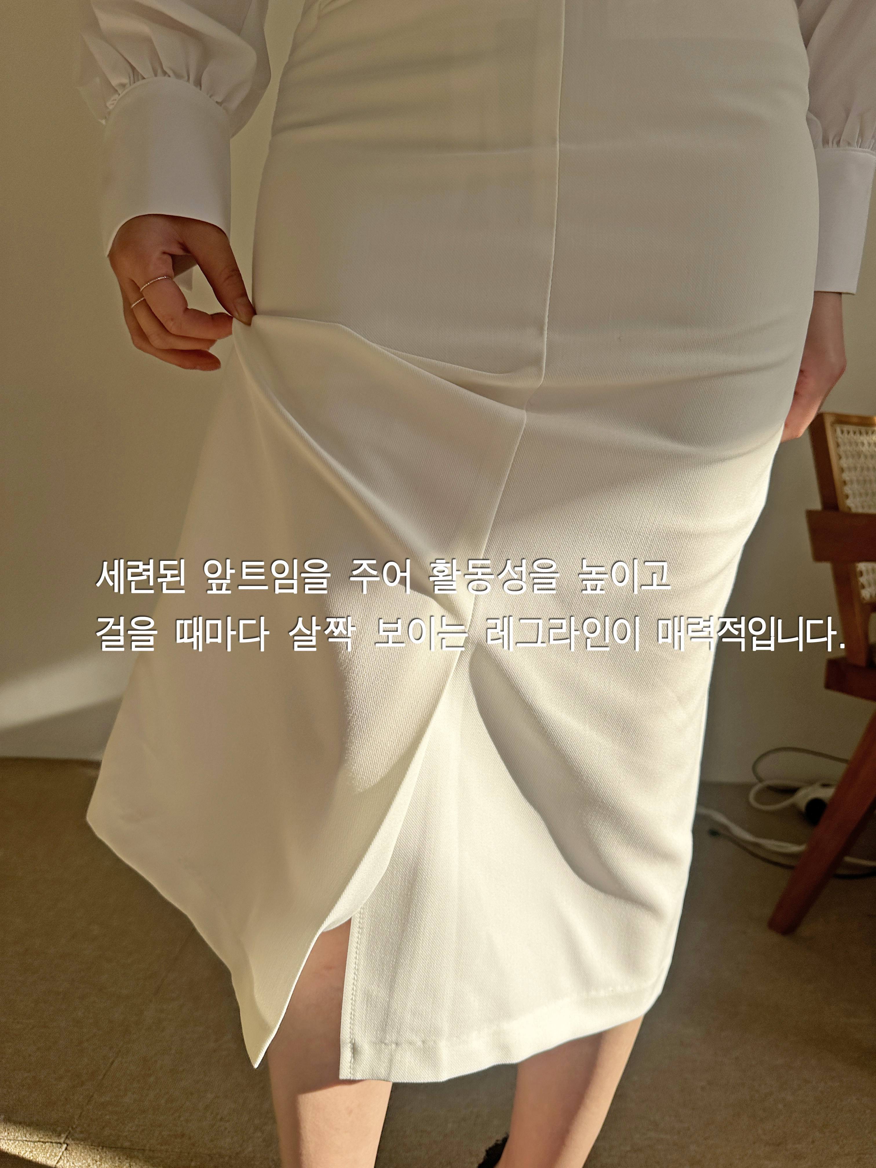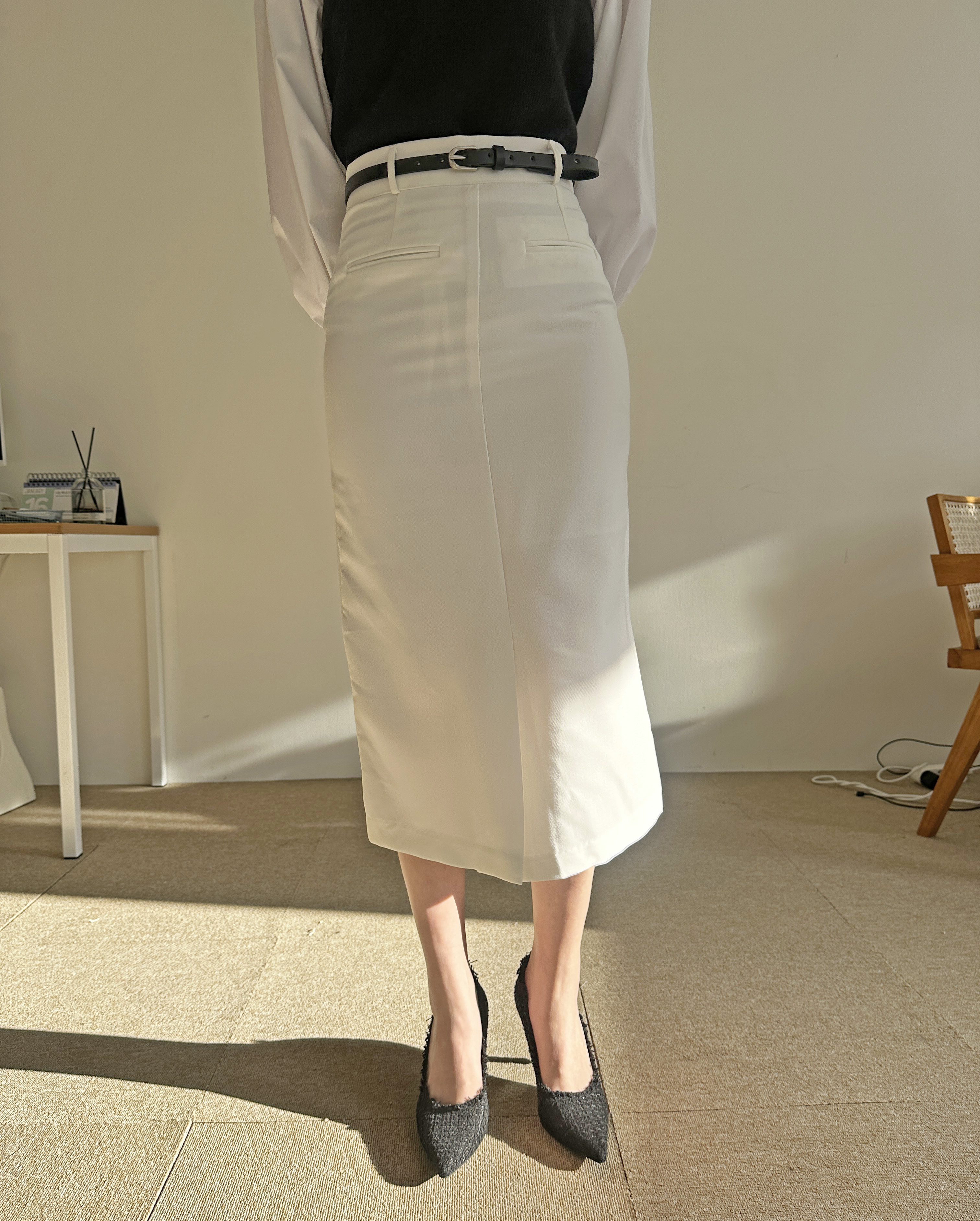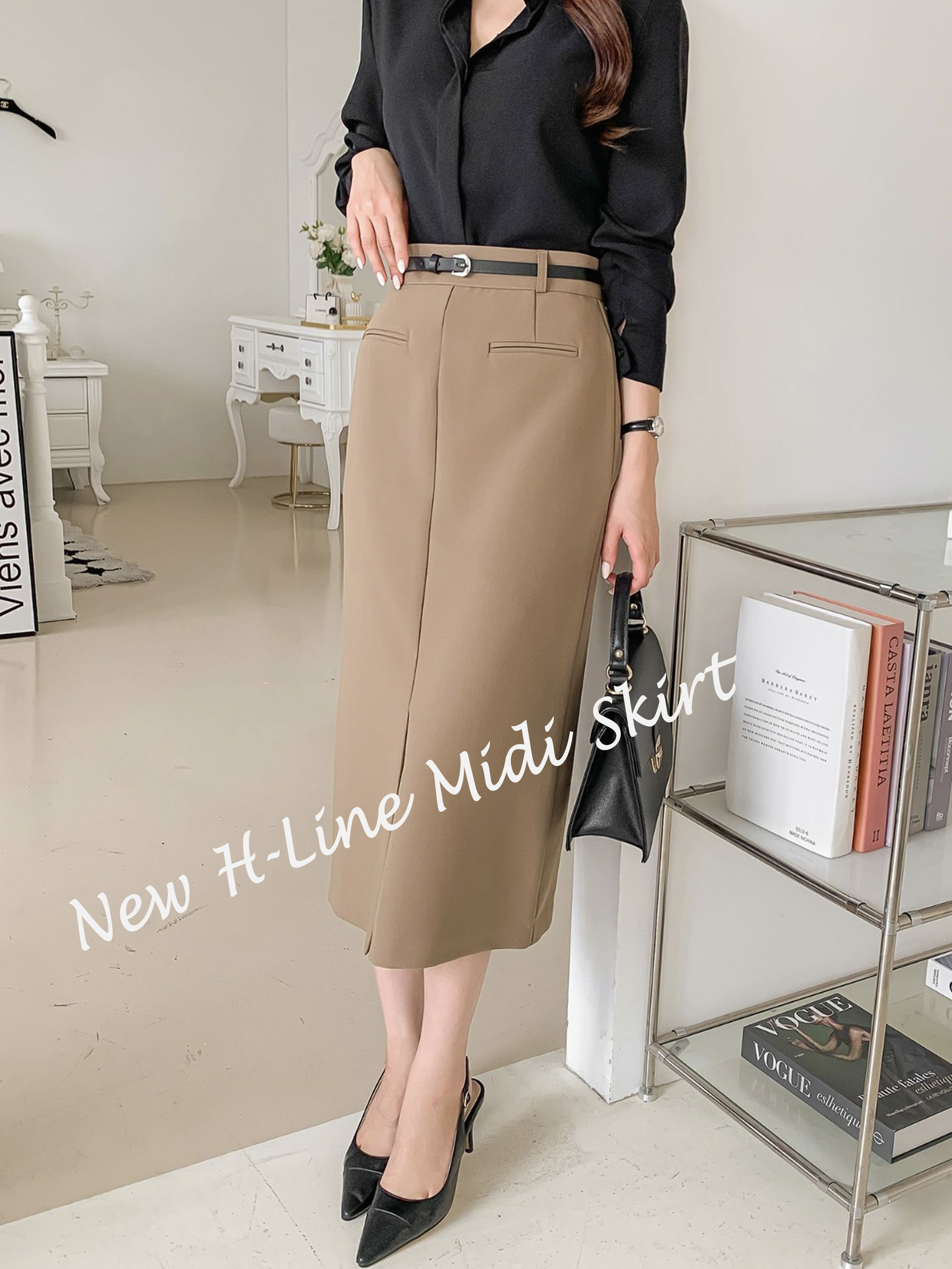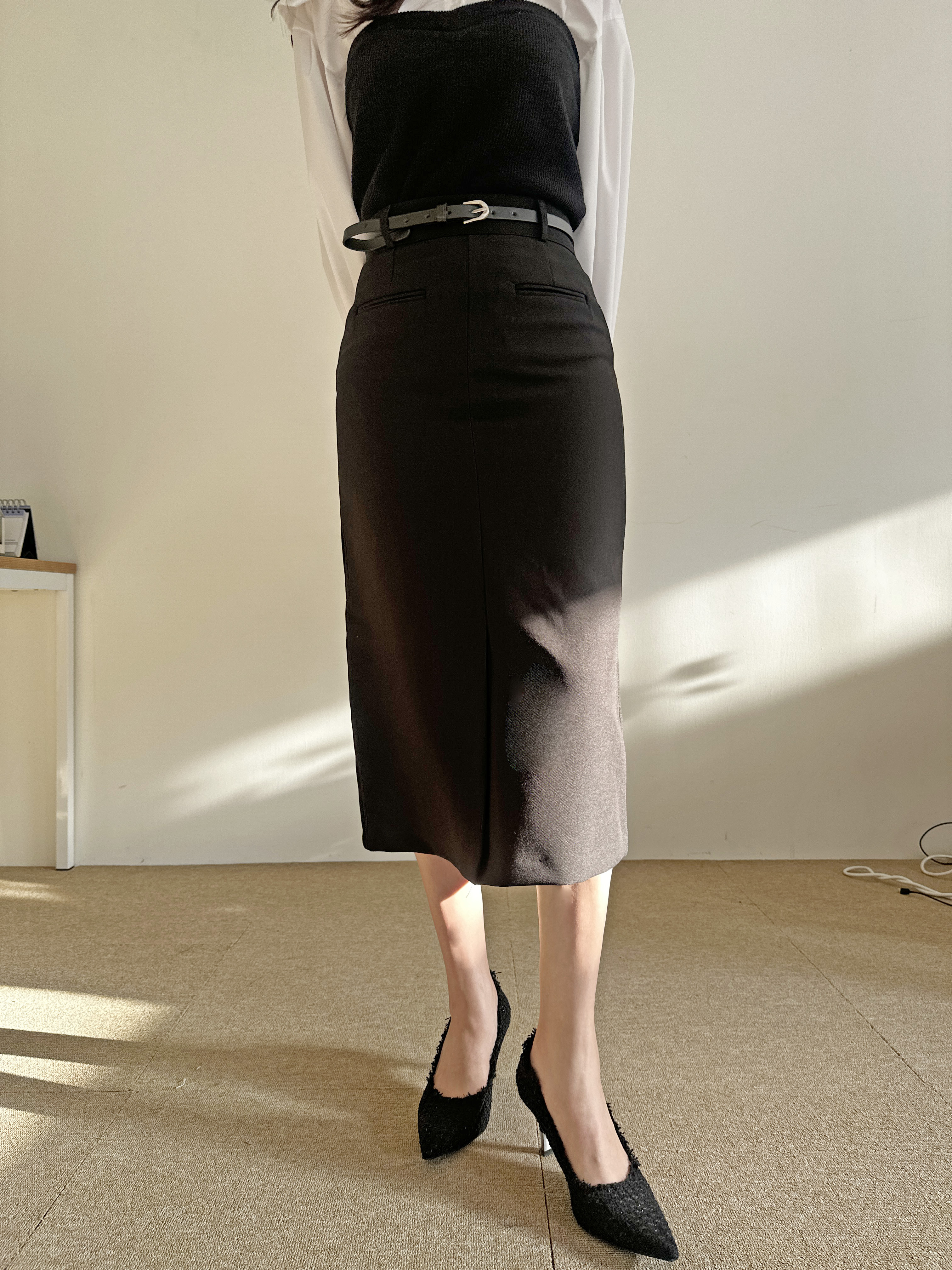 벨트세트 H라인 미디 스커트 하이웨스트 앞트임 정장치마 오피스룩 하객룩