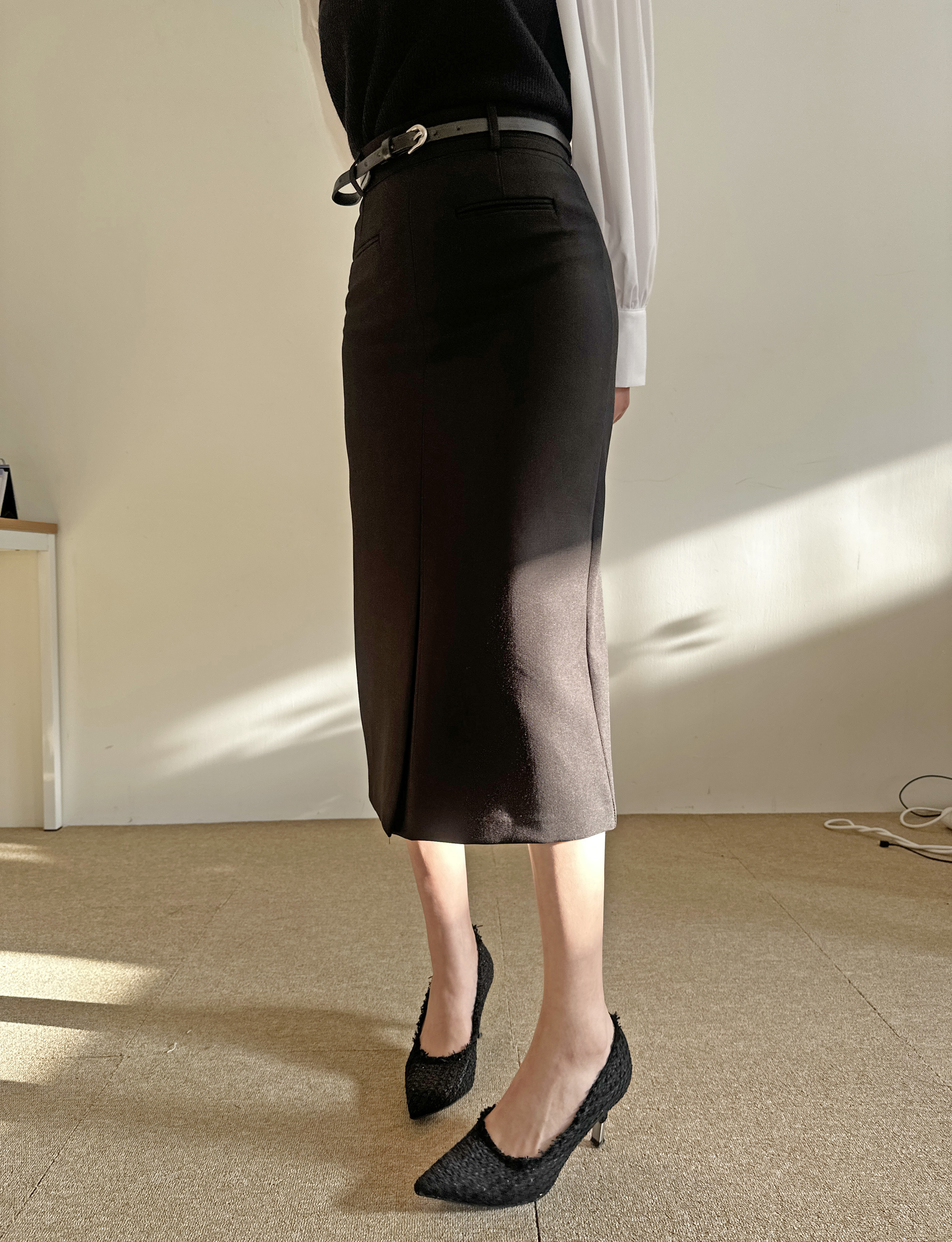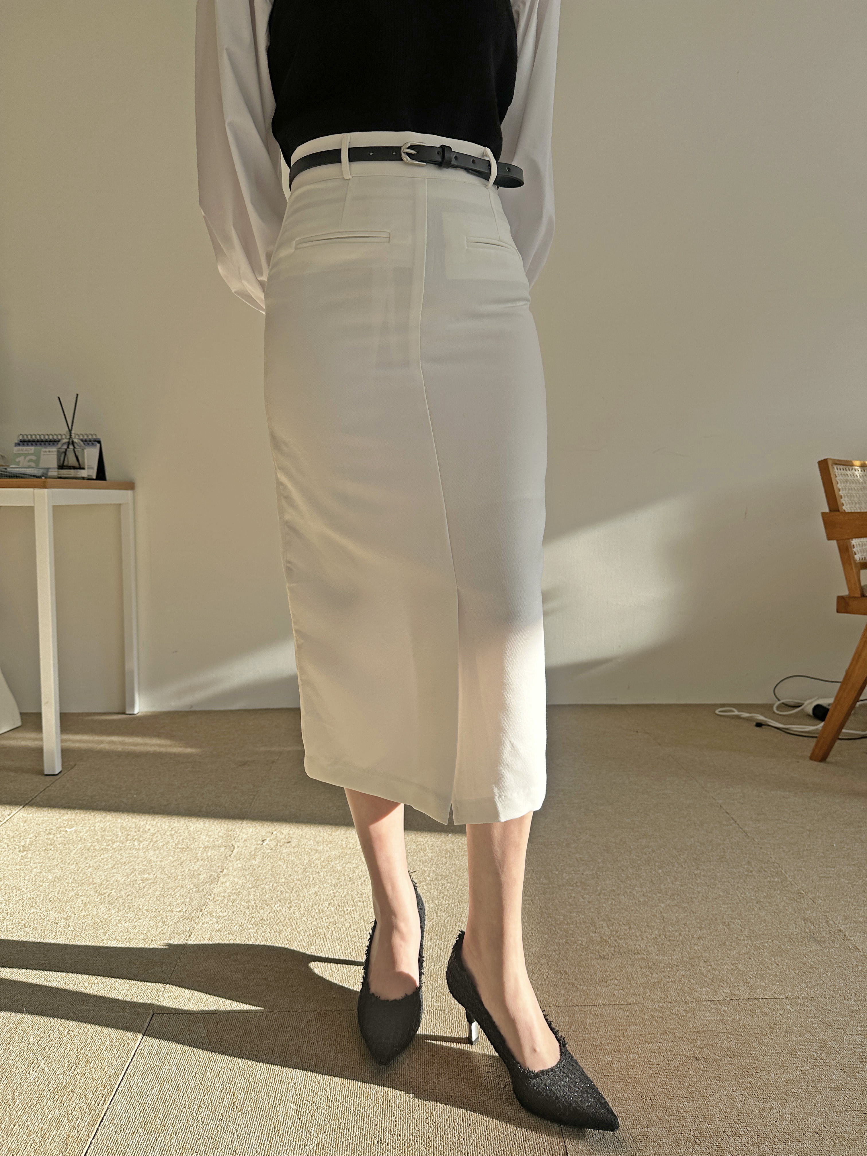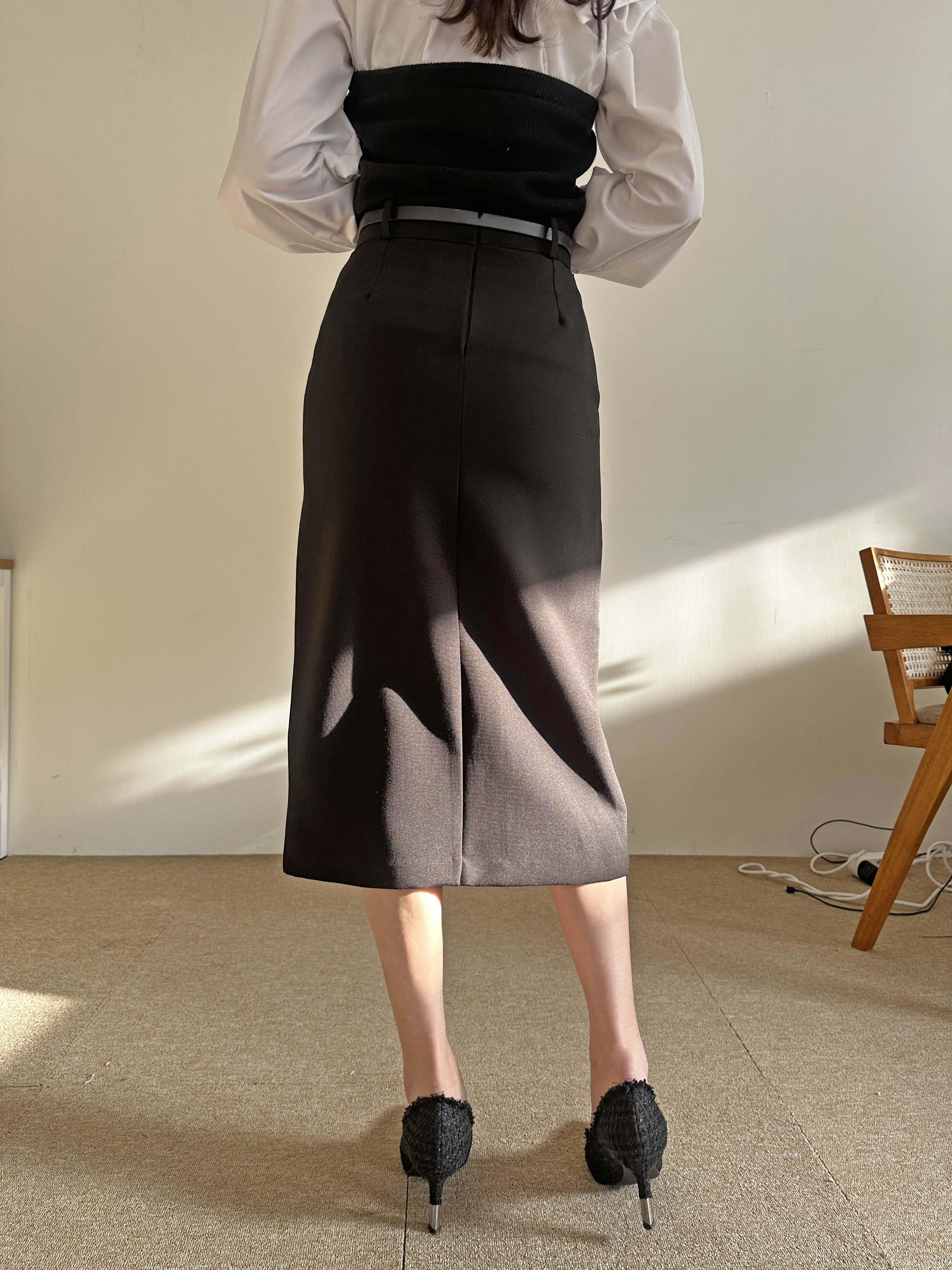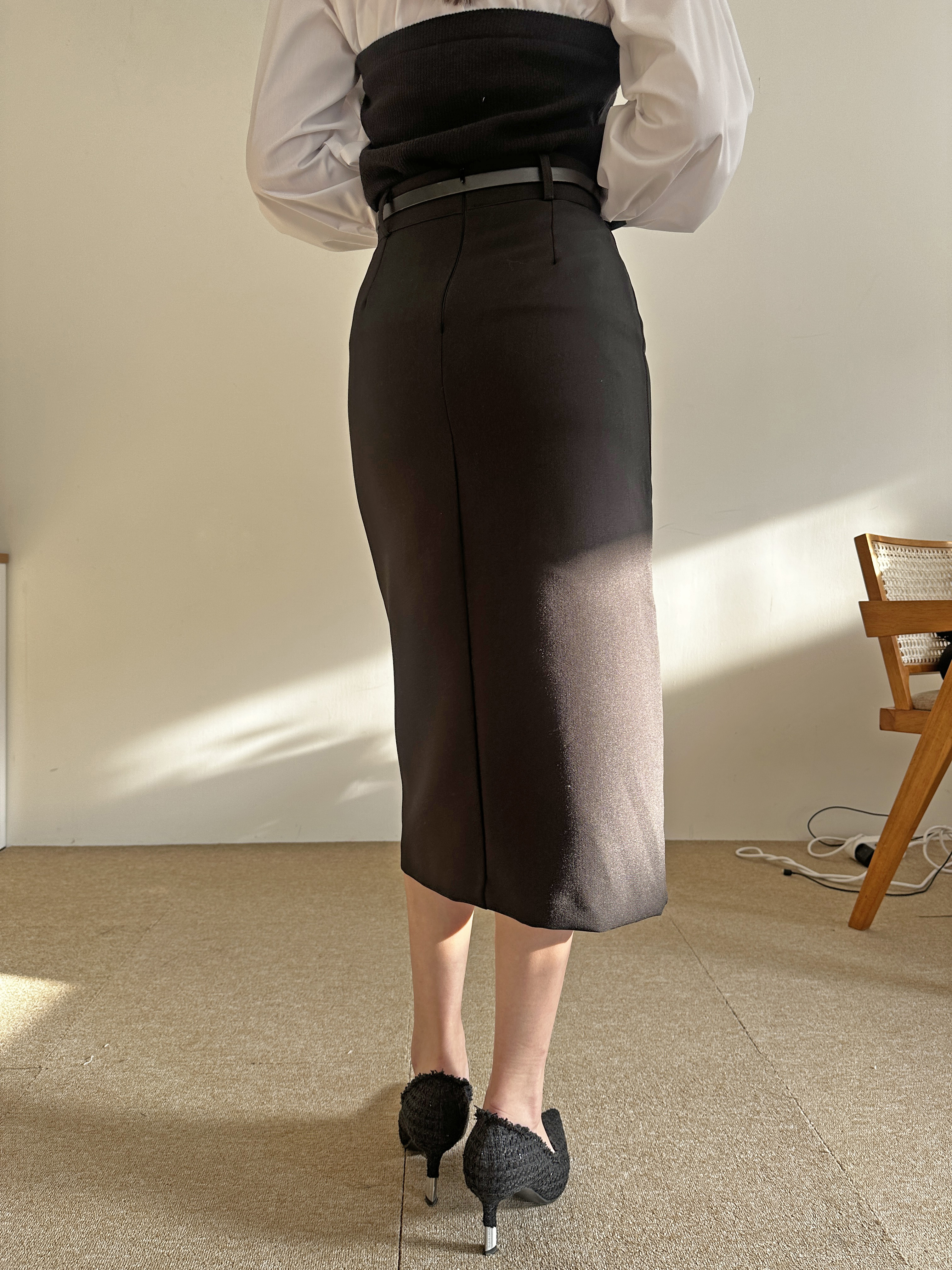 벨트세트 H라인 미디 스커트 하이웨스트 앞트임 정장치마 오피스룩 하객룩