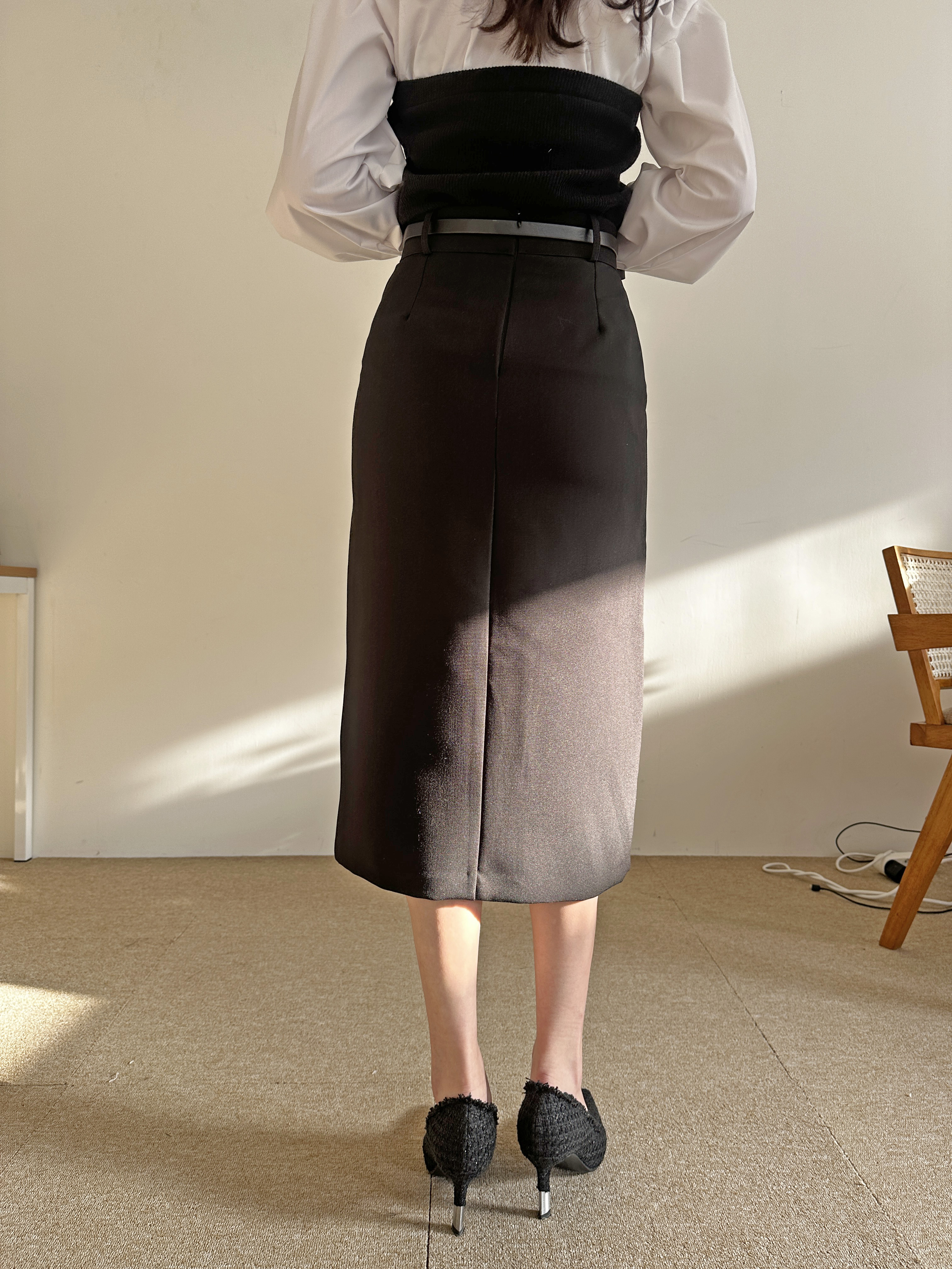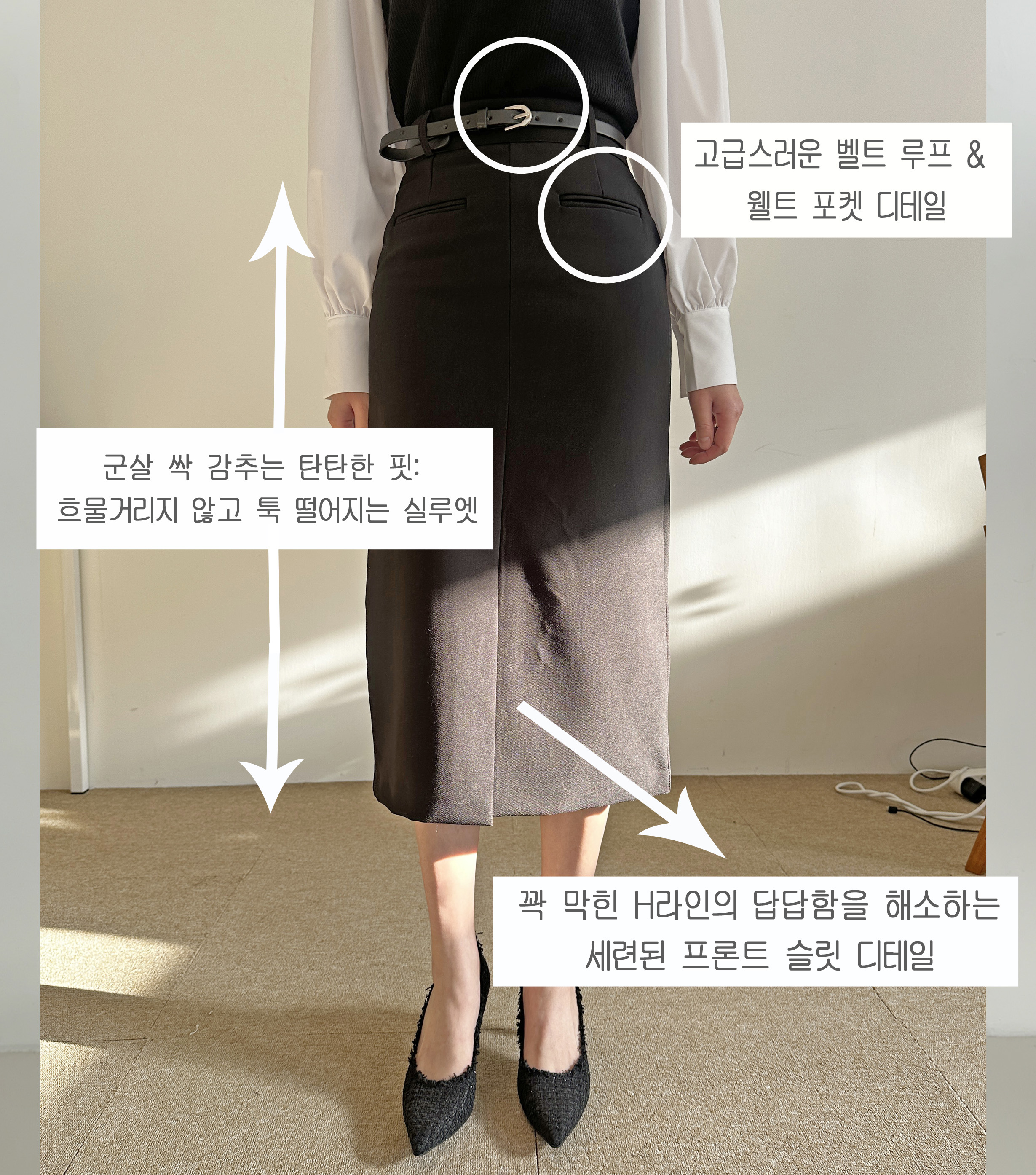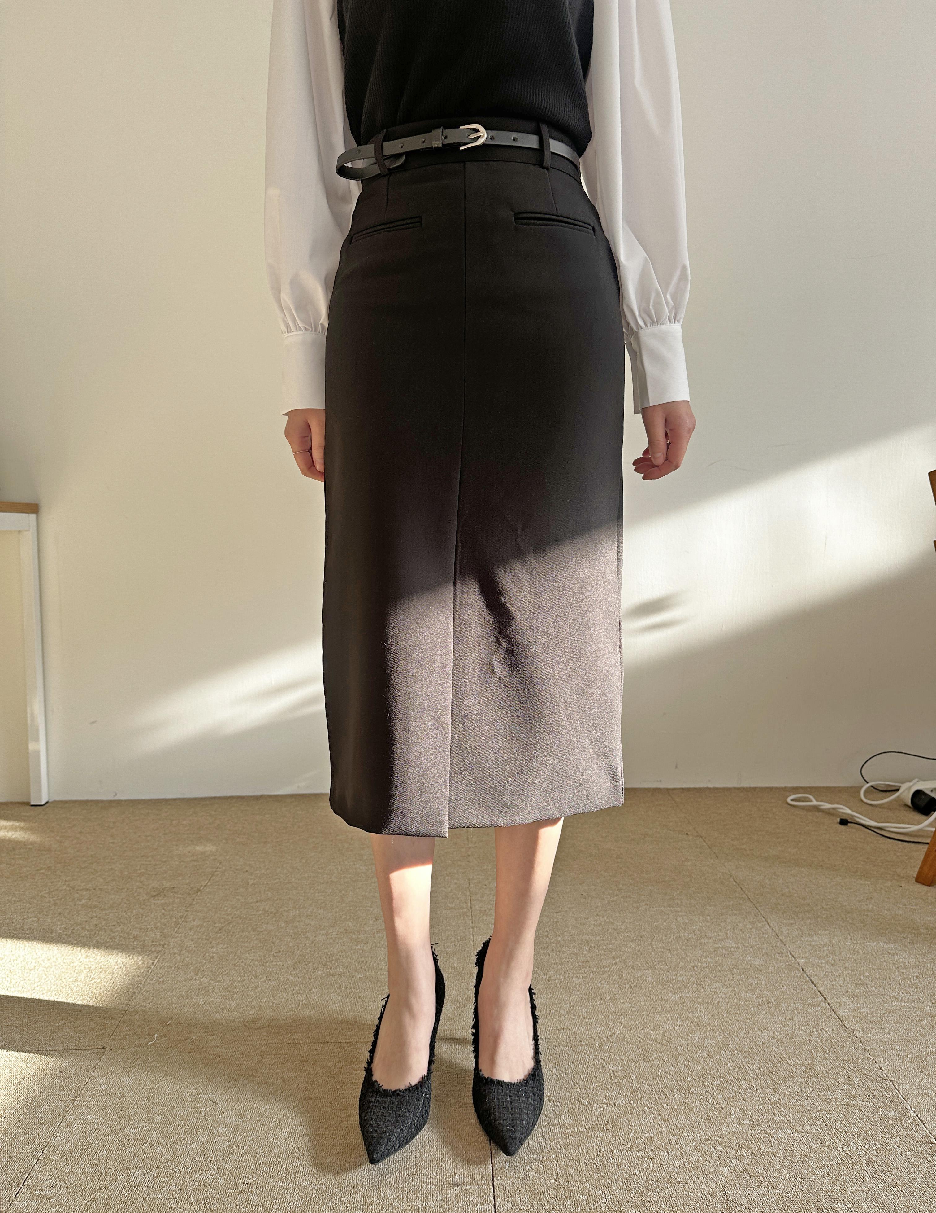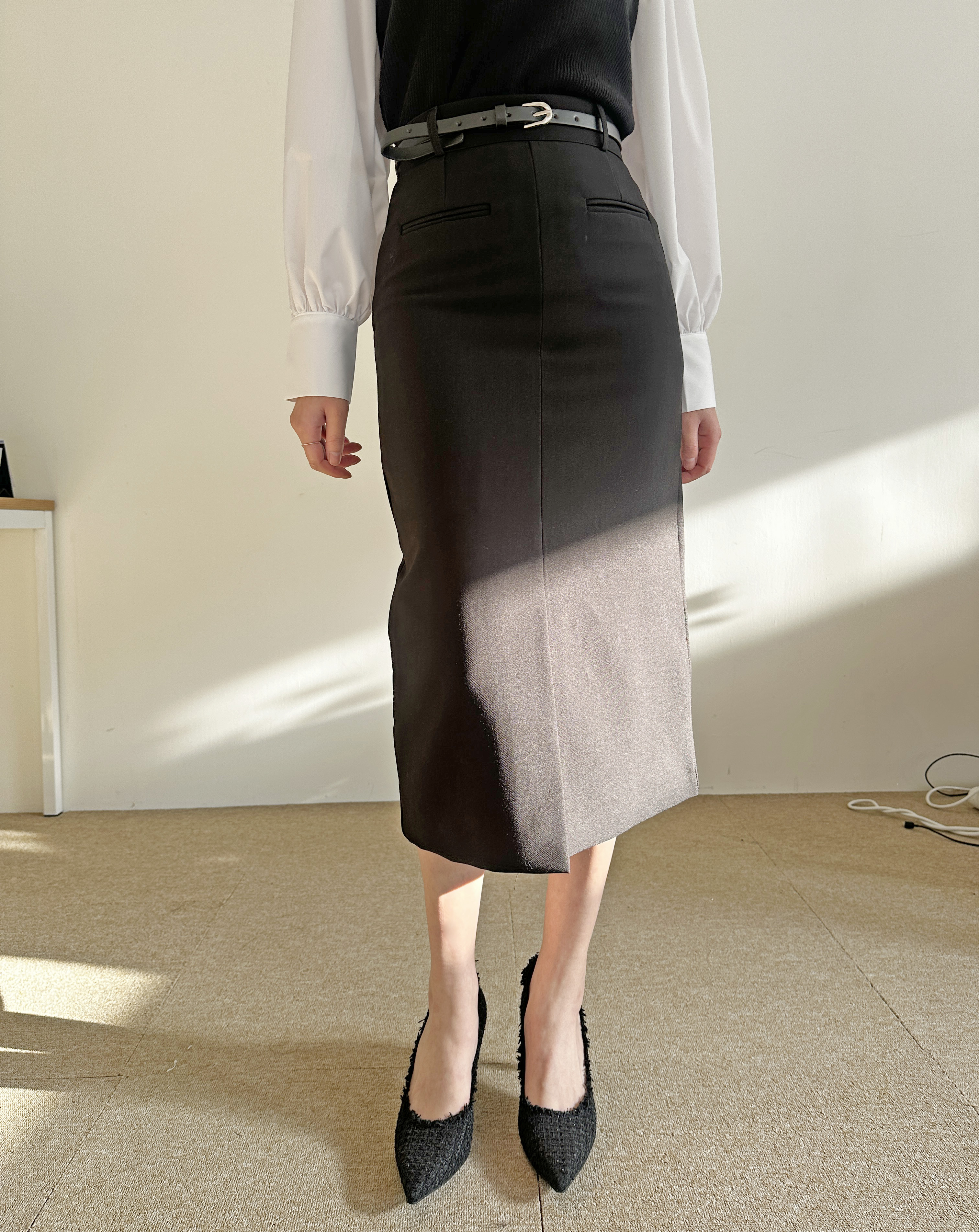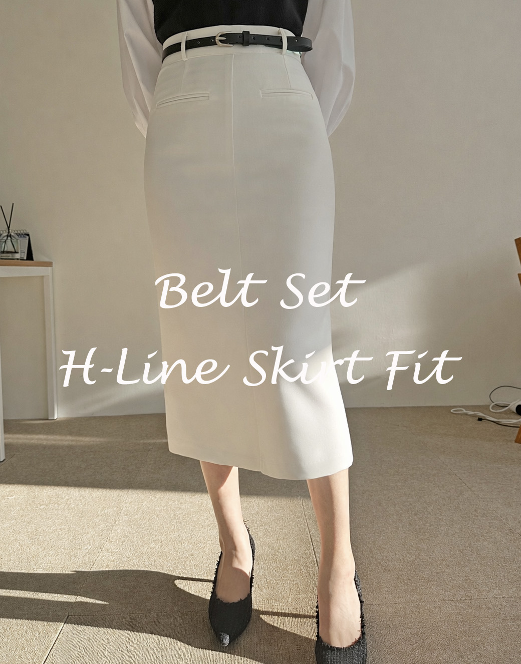 벨트세트 H라인 미디 스커트 하이웨스트 앞트임 정장치마 오피스룩 하객룩
