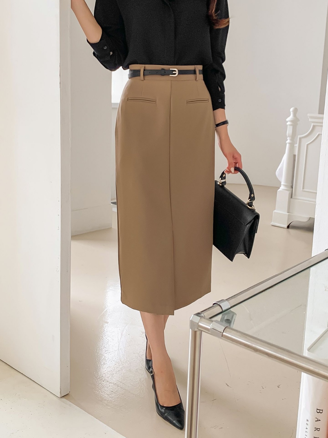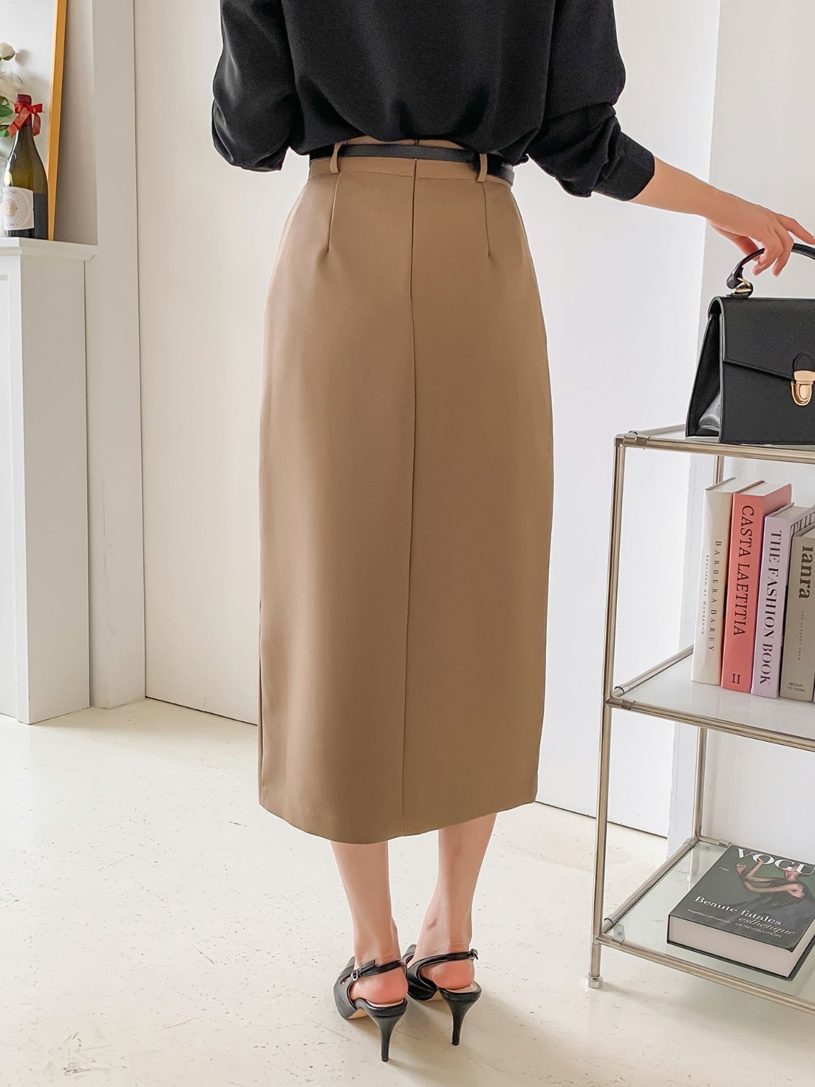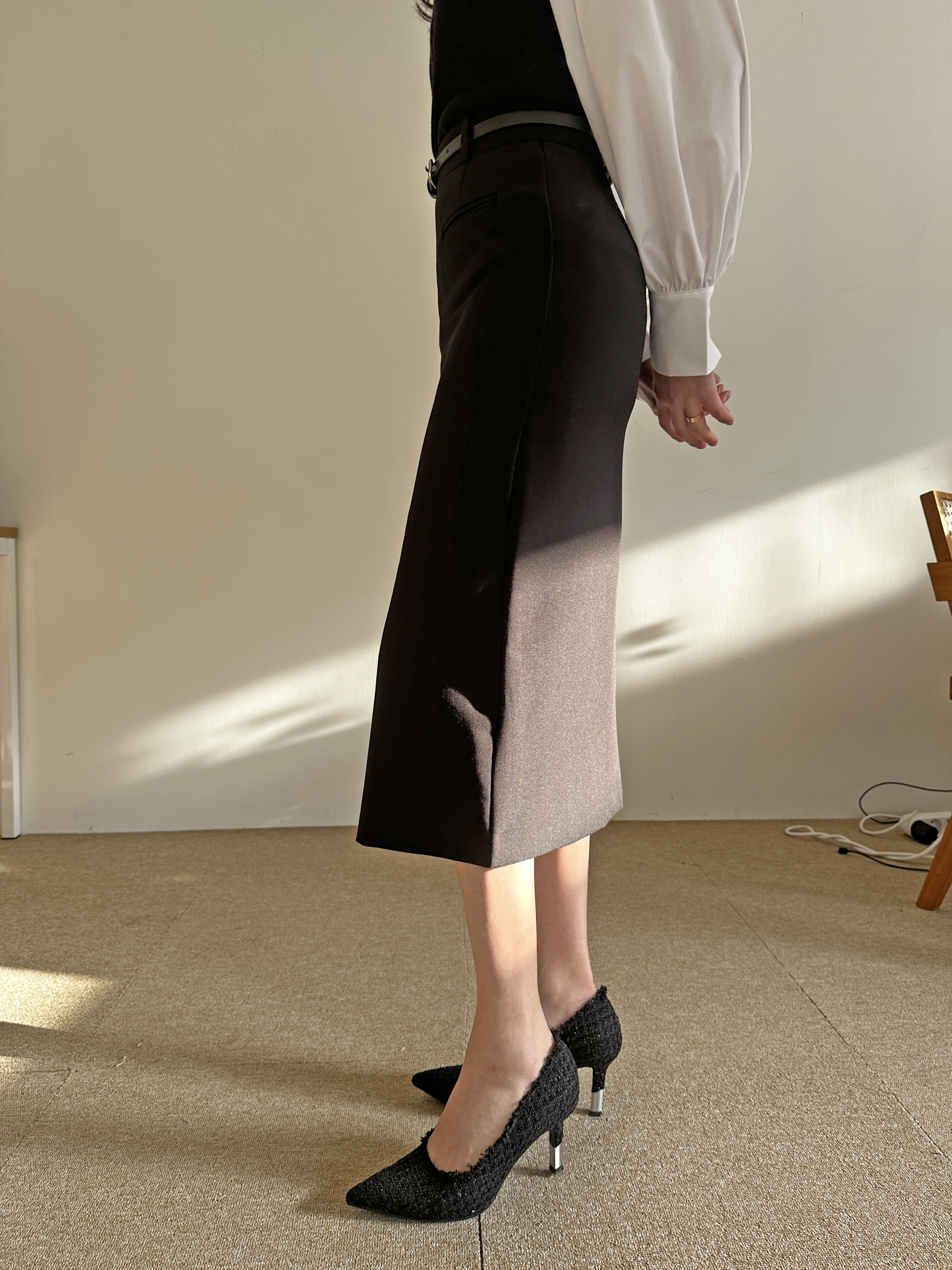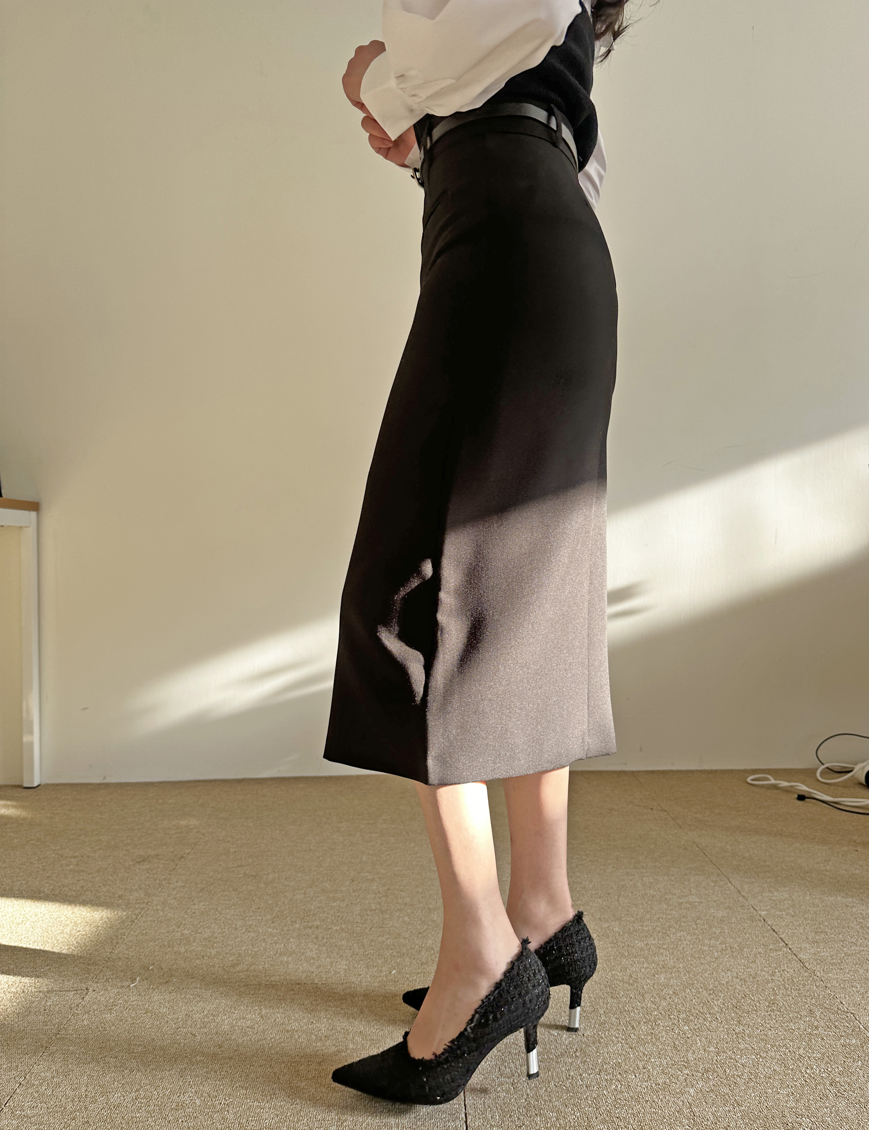 벨트세트 H라인 미디 스커트 하이웨스트 앞트임 정장치마 오피스룩 하객룩
