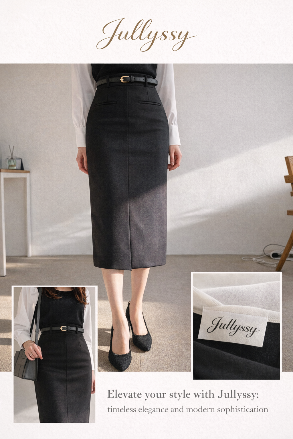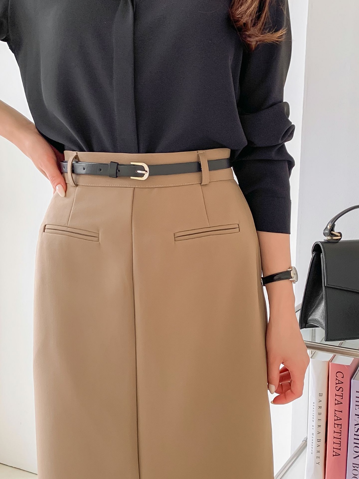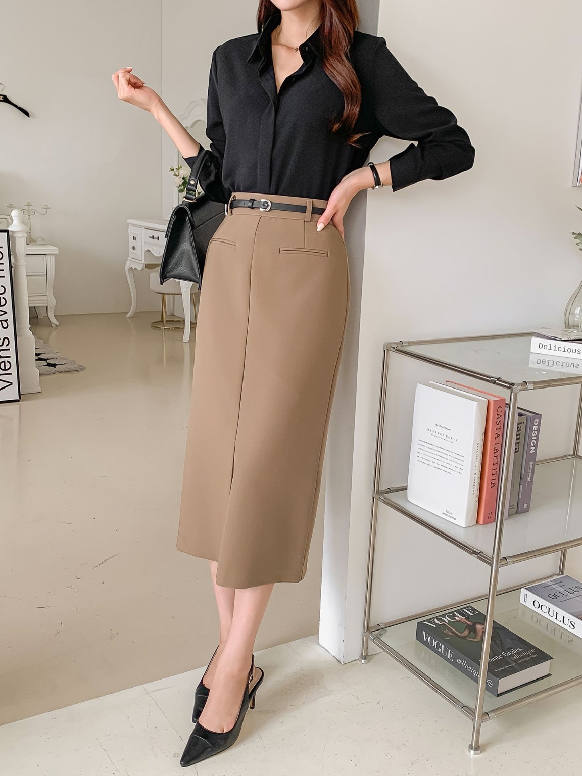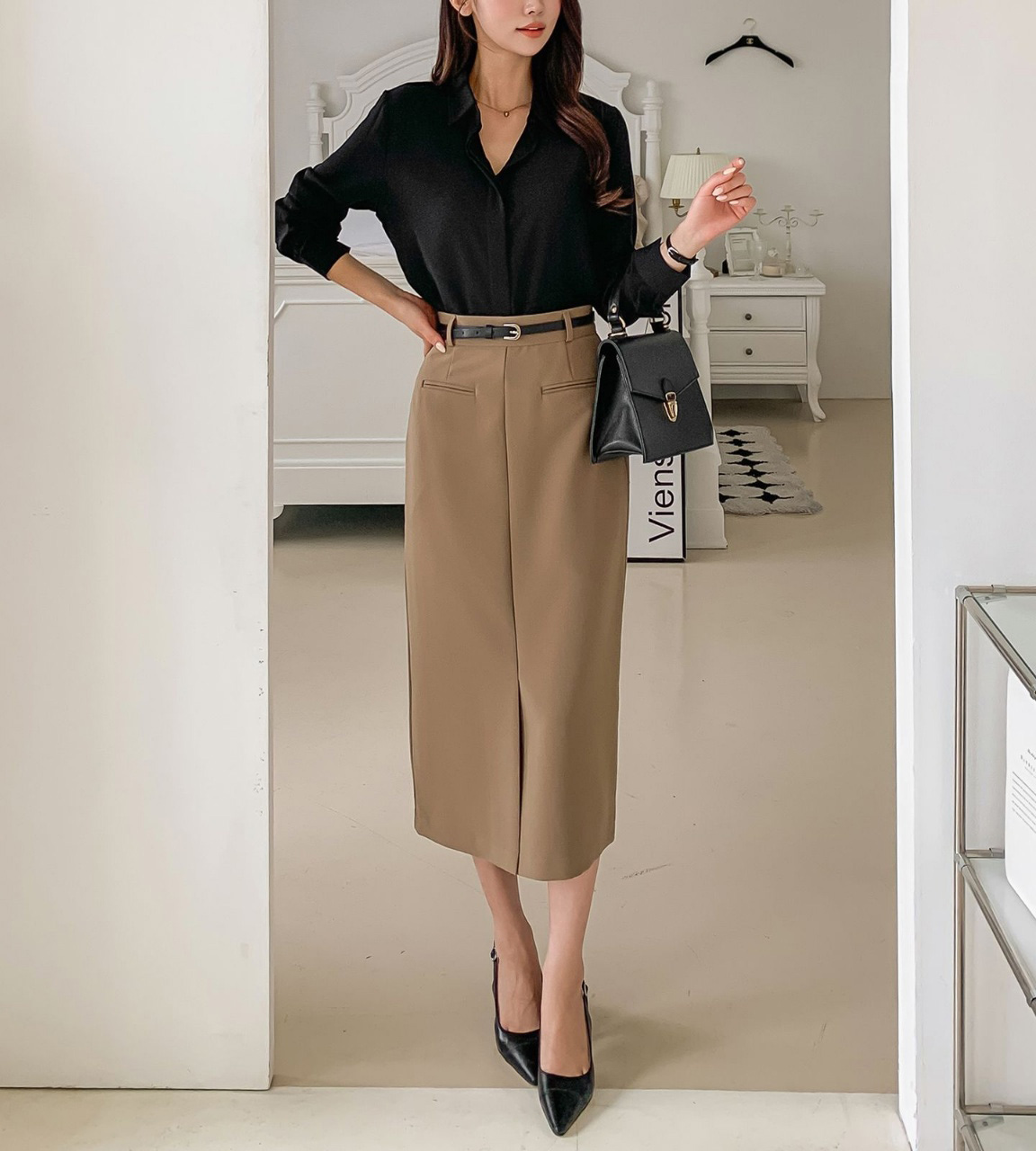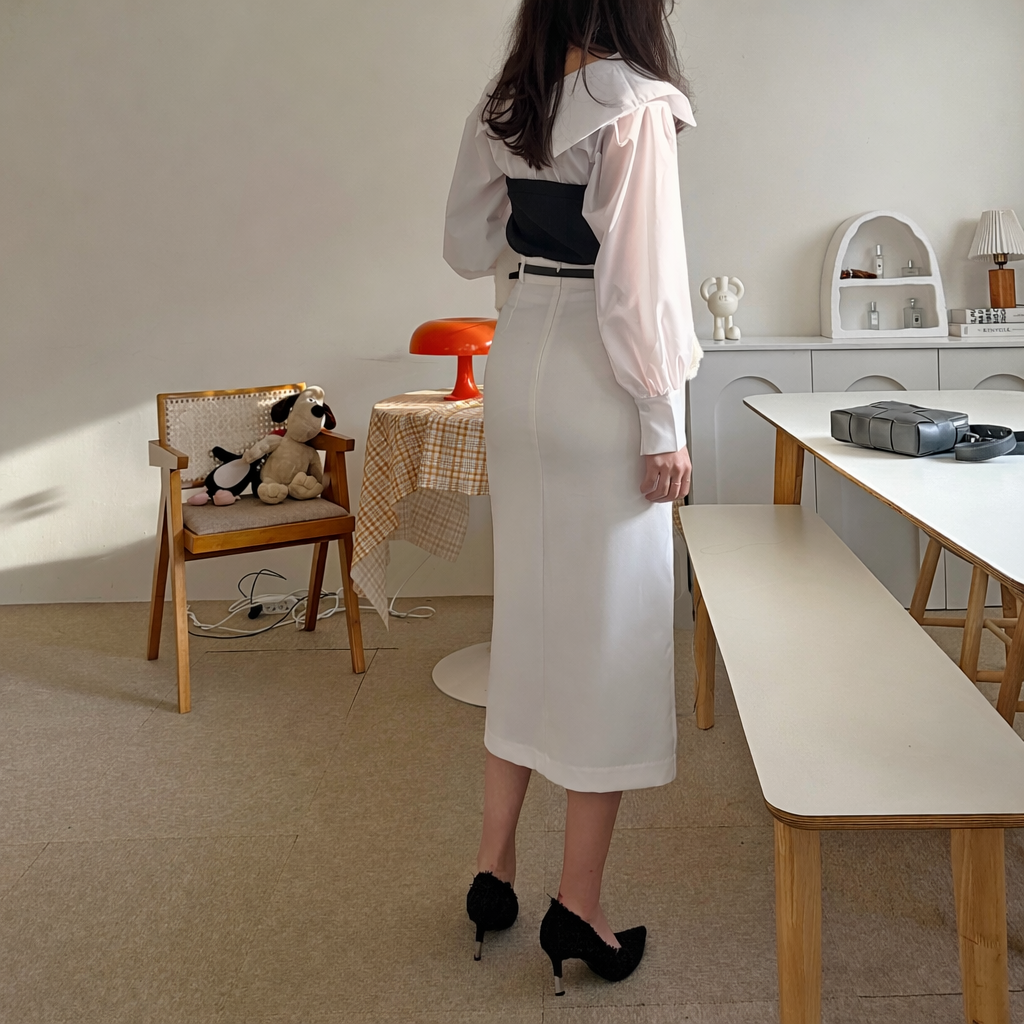 벨트세트 H라인 미디 스커트 하이웨스트 앞트임 정장치마 오피스룩 하객룩